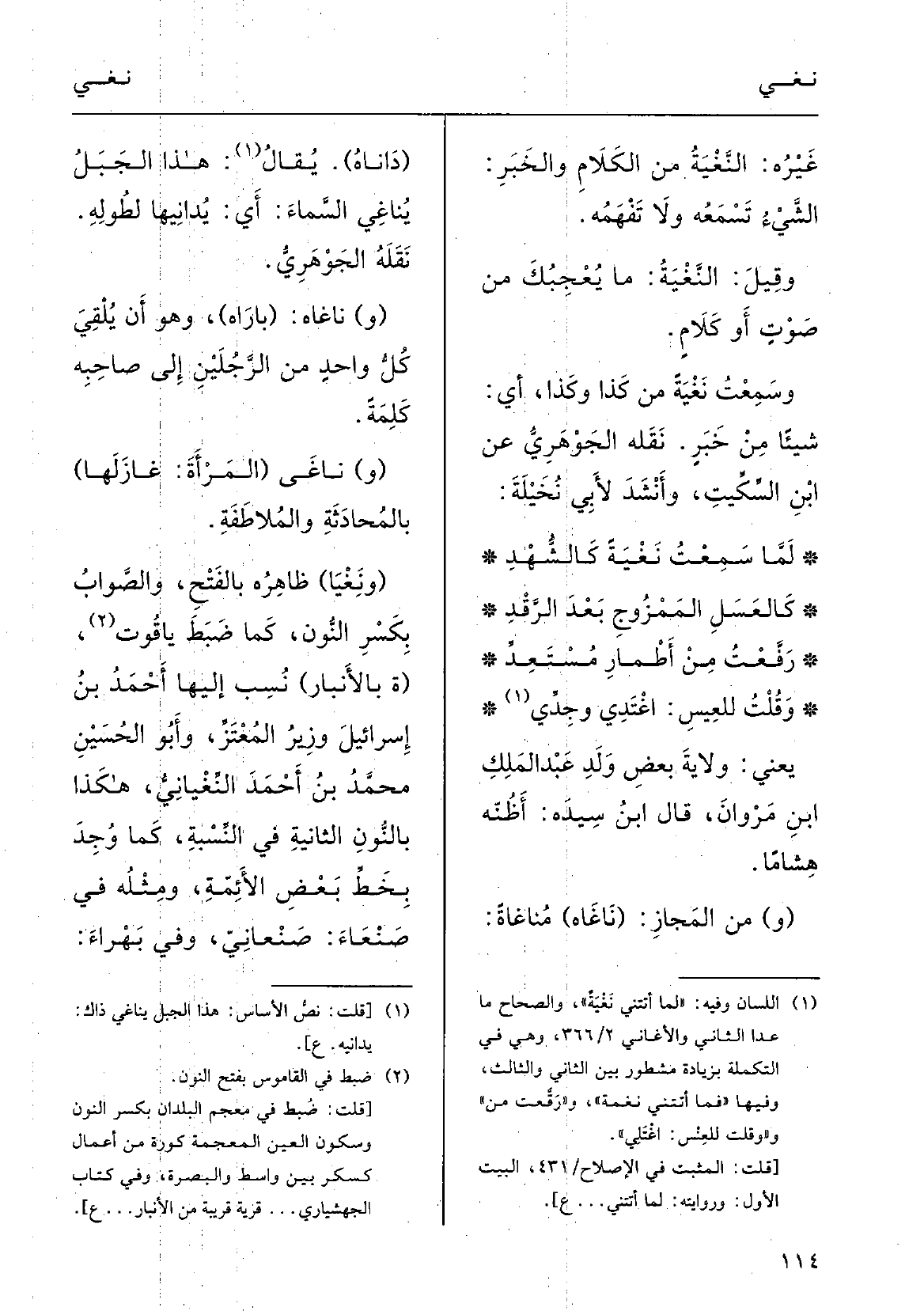 ( {ونَغِيَا) ؛ ظاهِرُه بالفتحِ والصَّوابُ بكَسْر النونِ كَمَا ضَبَطَه ياقوت؛ (ة بالأنْبار) نُسِبَ إِلَيْهَا أحمدُ بنُ إسْرائِيل وَزِيرُ المُعْتز، وأَبو الحُسَيْن محمدُ بنُ أحمدَ} النِّغيانيُّ؛ هَكَذَا بالنونِ الثانيةِ فِي النّسْبَةِ كَمَا وُجِدَ بخطِّ بعضِ الأَئِمَّةِ، ومِثْله فِي صَنْعاء صَنْعانيّ، وَفِي بَهْراء