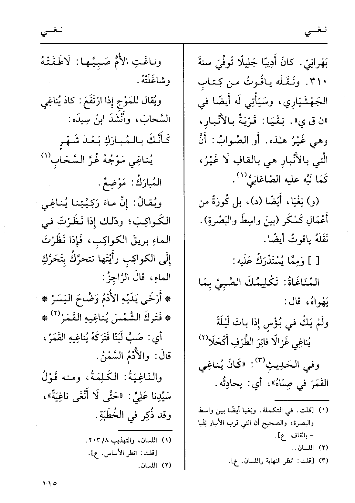 فتَركَ الشَمسَ {يُناغِيهِ القَمَرأَي صَبَّ لَبَناً فتَركَه يُناغِيه القمرُ، قالَ: والأُدْم السَّمْنُ،} والناغِيَةُ: الكَلمةُ؛ وَمِنْه قولُ سيِّدنا عليَ: (حَتَّى لَا {أَنْغَى} ناغِيَة) ؛ وَقد ذُكِرَ فِي الخُطْبةِ.