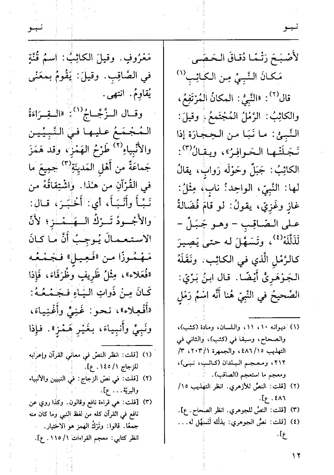 وَقَالَ الزجَّاجُ: القِراءَةُ المُجْمَعُ عَلَيْهَا فِي! النَّبِيّين والأنْبياء طَرْح الهَمْزة، وَقد هَمَز جماعَةٌ مِن أَهْلِ المَدينَةِ جَمِيعَ مَا فِي القُرْآنِ من هَذَا؛ واشْتِقاقُه مِن نَبَّأَ وأَنْبَأَ، أَي أَخْبَر؛ قالَ: والأَجْود تَرْكَ الهَمْز لأنَّ الاسْتِعمالَ يُوجِبُ أَنَّ مَا كانَ مَهْموزاً مِن فَعِيل فَجَمعه فُعَلاء مِثْل ظَرِيفٍ وظُرَفاء، فَإِذا كانَ مِن ذواتِ الياءِ فجمْعُه أَفْعِلاء نَحْو غَنِيَ وأَغْنِياء ونَبِيَ وأَنْبِياء بغَيْرِ هَمْز، فَإِذا