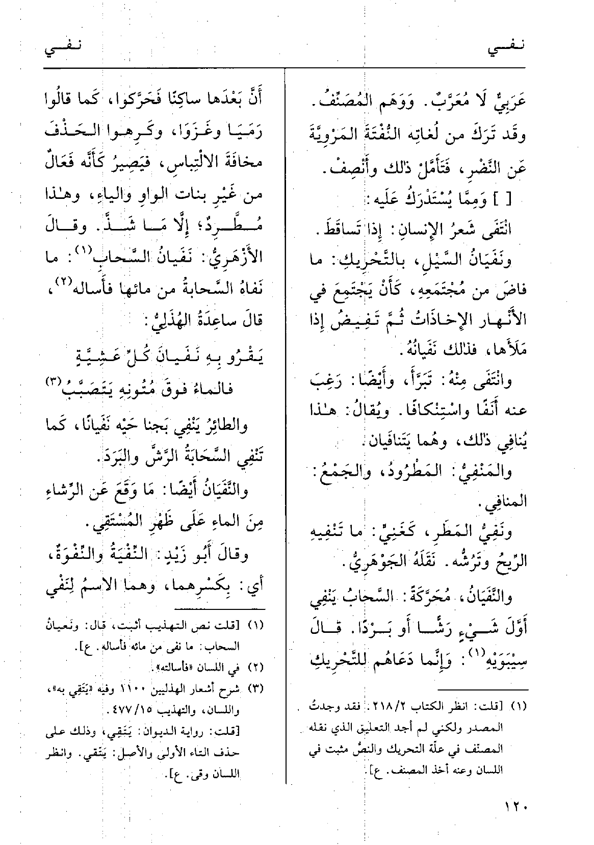 وَقَالَ الأزْهري نَفَيانُ السَّحابِ: مَا {نَفاهُ السَّحابَةُ مِن مائِها فأَسالَهُ؛ قَالَ ساعِدَةُ الهُدَلي: