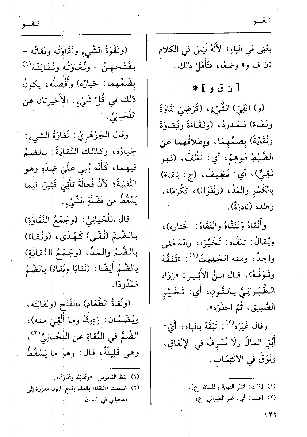 : (و ( {نَقِيَ) الشَّيءُ، (كرَضِيَ،} نَقاوَةً {ونَقاءً) ، مَمْدودٌ، (} ونَقاءَةً {ونُقاوَةً} ونُقايَةً) ، بضمِّهما وإطْلاقِهما عَن الضّبْطِ موهم: أَي نظفَ، (فَهُوَ {نَقِيٌّ) ، أَي نَظِيفٌ، (ج} نِقاءٌ) ، بالكسْر والمدِّ، ( {ونُقَواءُ) ، ككُرَماءِ، وَهَذِه (نادِرَةٌ.