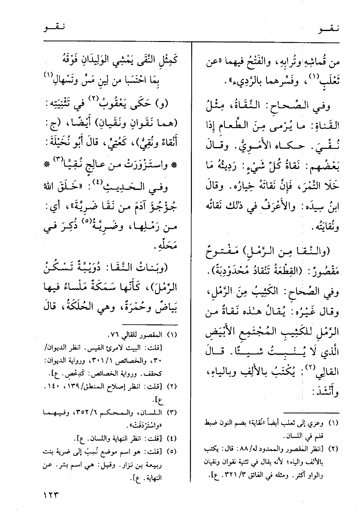 بِمَا احْتَسَبَا مِن لينِ مسٍ وتسْهَالِ (و) حَكَى يَعْقوب فِي تَثْنِيتِه: (هُما: {نَقَوانِ ونَقَيانِ) أَيْضاً، (ج} أَنْقاءٌ {ونُقِيٌّ) ، كعُتِيَ؛ قالَ أَبو نُخَيْلة: