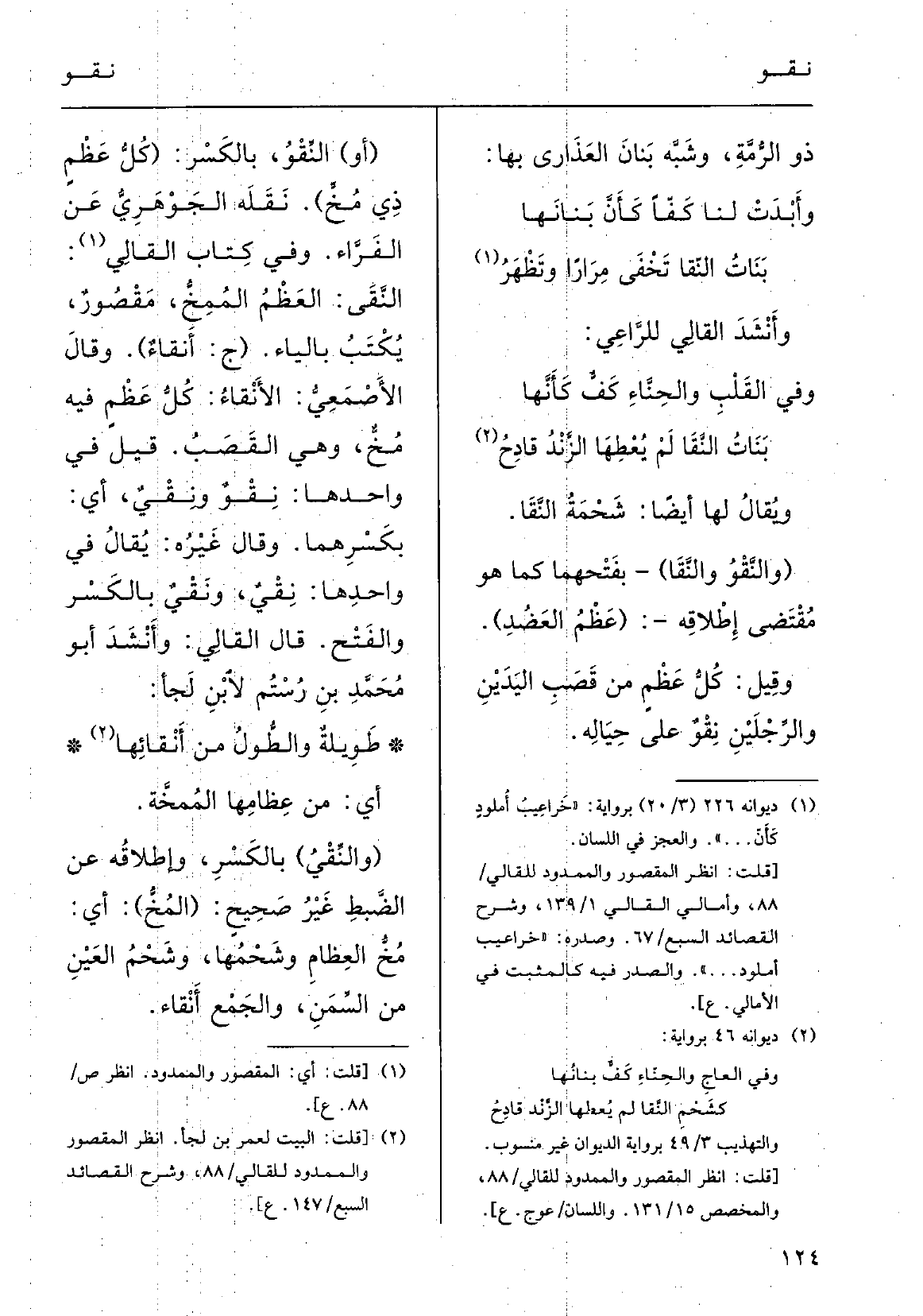 وَفِي كتابِ القالِي:} النَّقْي العَظْمُ المُمخ مَقْصورٌ يُكْتَبُ بالياءِ؛ (ج {أَنْقاءٌ) .