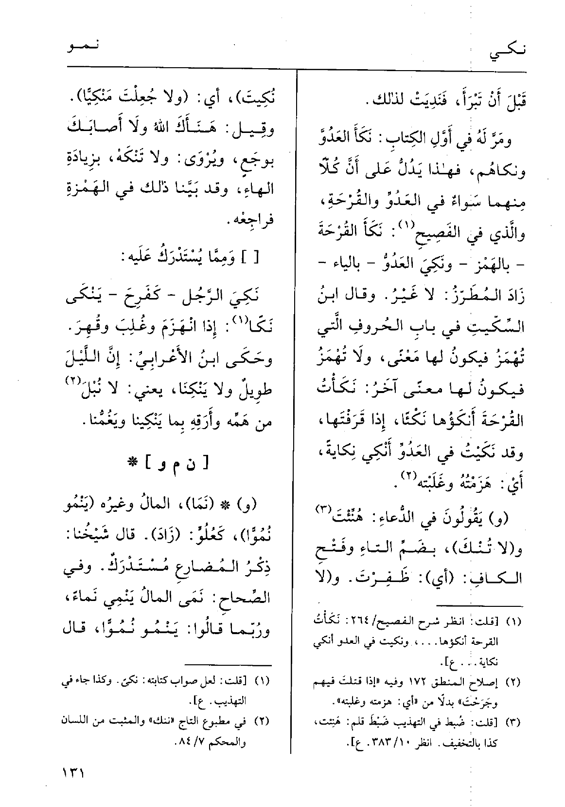 وَالَّذِي فِي الفَصِيح: نَكَأَ القَرْحَةَ، بالهَمْز، {ونَكَى العَدُوَّ، بالياءِ؛ زادَ الْمُطَرز: لَا غَيْرِ.