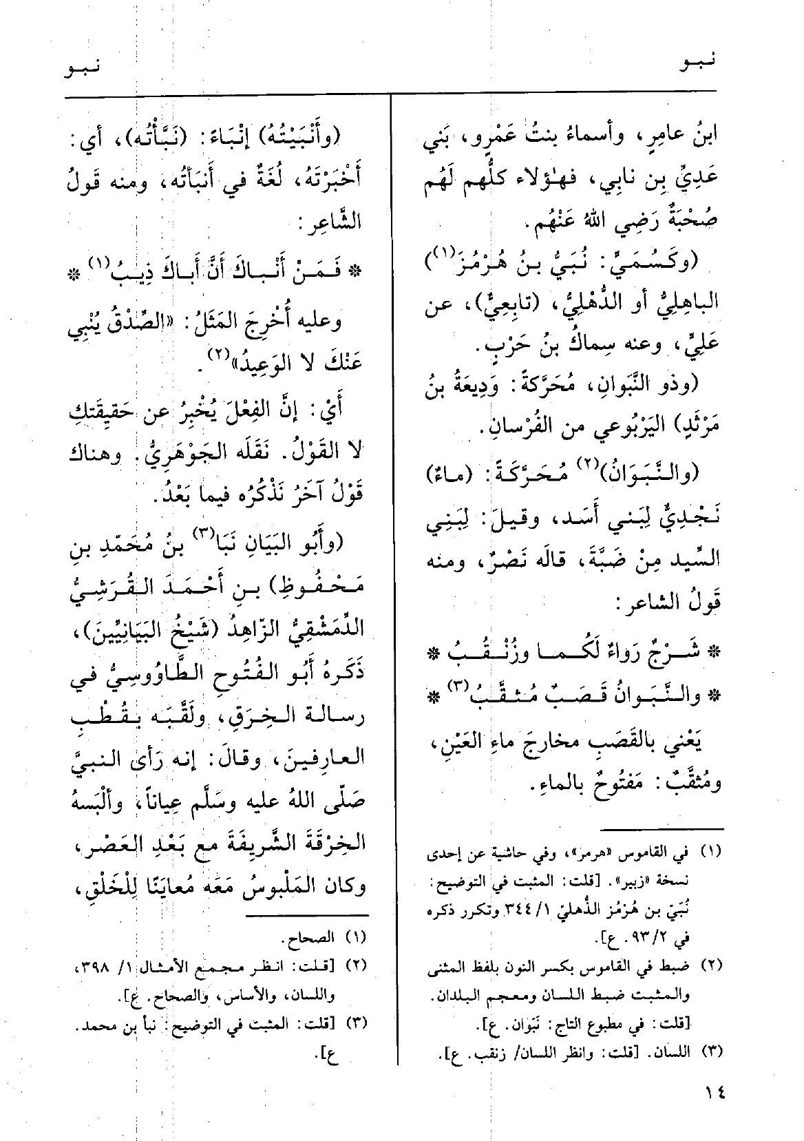 وَعَلِيهِ أُخْرِجَ المَثَلُ: " الصِّدْقُ! يُنْبِي عَنْكَ لَا الوَعِيدُ ". أَيْ: إِنَّ الفِعْلَ يُخْبِرُ عَن حَقيِقَتكِ لَا القَوْلُ. نَقَلَه الجَوْهَرِيُّ. وَهُنَاكَ قَوْلُ آخَرُ نَذْكُرُه فِيمَا بَعْدُ. (وأَبُو البَيَانِ نَبَا بنُ مُحَمّدِ بنِ مَحْفُوظِ) بنِ أَحْمَدَ القُرَشِيُّ الدِّمَشْقِيُّ الزّاهِدُ (شَيْخُ البَيَانِيِّينَ) ، ذَكَرهُ أَبُو الفُتُوحِ الطَّاوُوسِيُّ فِي رِسَالَة الخِرَقِ، ولَقَّبَه بقُطْبٍ العارِفينَ، وقالَ: إِنَّه رَأى النبيَّ