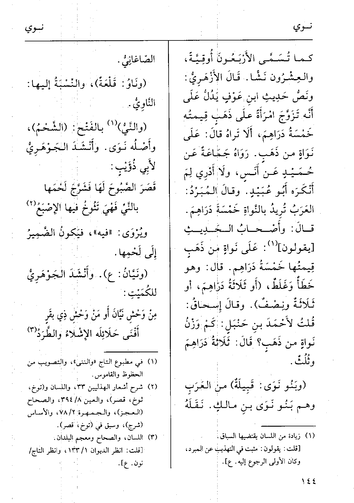 قالَ الأزْهري: ونَصّ حديثِ ابنِ عَوْفِ يدلُّ على أنَّه تزوَّجَ امرأَةً على ذَهَبٍ قيمتُه خَمْسةُ دَراهِمَ، أَلا تَراهُ قَالَ: على {نَواةٍ مِن ذَهَب؟ رَواهُ جماعَةٌ عَن حُميدِ عَن أَنَس، وَلَا أَدْرِي لمَ أَنْكَرَه أَبو عبيدٍ.