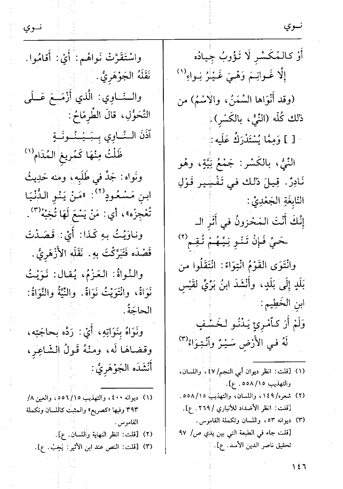 ظَلْتُ منْها كمُرِيغِ المُدامِ} ونَواهُ: جَدَّ فِي طَلَبِه؛ وَمِنْه حديثُ ابْن مَسْعودٍ: (مَنْ {يَنْوِ الدُّنْيا تُعْجِزْه) ، أَي مَنْ يَسْعَ لَهَا تُخِبْهُ.