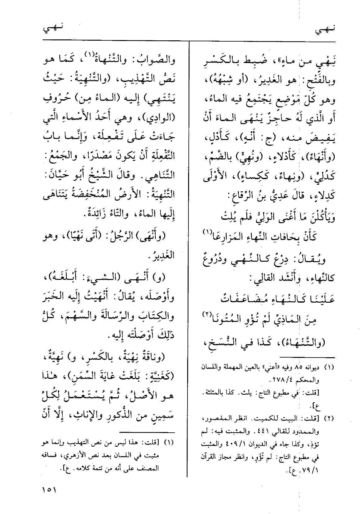{نِهْيٍ مِن ماءٍ، ضُبِطَ بالكَسْر والفَتْح، هُوَ الغَدِيرُ (أَو شِبْهُهُ) ، وَهُوَ كلُّ مَوْضِع يَجْتَمِعُ فِيهِ الماءُ، أَو الَّذِي لَهُ حاجِزٌ} يَنْهَى الماءَ أَن يَفِيضَ مِنْهُ، (ج أَنْهٍ) ، كأَدْلٍ، ( {وأنْهاءٌ) ، كأدْلاءٍ (} ونُهِيٌّ) ، بِالضَّمِّ كدُلِيَ، ( {ونِهاءٌ، ككِساءٍ) ، الأَوْلى كدِلاءٍ، قالَ عَدِيُّ بنُ الرِّقاع: ويأكلن مَا أغْنى الْوَلِيّ فَلم يلت كَأَن بحافات} النِّهاءِ المزارعا وَيُقَال: درع {كالنِّهْي ودروع كالنهاء، وَأنْشد القالي: علينا} كَالنِّهَاءِ مضاعفات من الماذي لم تؤو المتونا {والتَّنْهَاءُ كَذَا فِي النّسخ، وَالصَّوَاب:} التَّنُهاةُ كَمَا هُوَ نَص التَّهْذِيب، {والتَّنْهِيَةُ: حَيْثُ} يَنْتَهِي إِلَيْهِ المَاء من حُرُوف الْوَادي وَهِي أحد الْأَسْمَاء الَّتِي جَاءَت على تفعلة و: