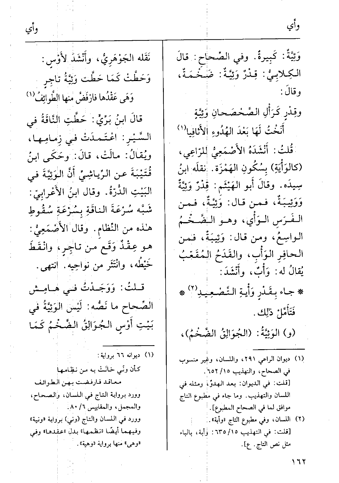 وقالَ أَبو الهَيْثم: قدْرٌ وَئِيَّةٌ ووَئِيبَةٌ، فمَنْ قالَ وَئِيَّة فمِن الفَرَسِ {الوَأَي وَهُوَ الضَّخْمُ الواسِعُ، ومَنْ قَالَ وَئِيبَةً فمِنَ الحافِرِ الوَأْب، والقَدَحُ المُقَعَّبُ يقالُ لَهُ وَأْبٌ؛ وأَنْشَدَ: