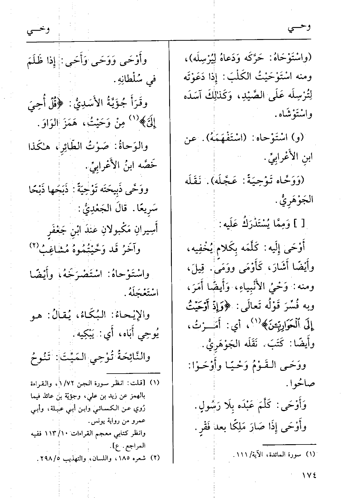 } أَوْحَى إِلَيْهِ: كلَّمهُ بكَلامٍ يُخْفِيهِ وأَيْضاً: أَشارَ، كأَوْمَأَ ووَمَأَ؛ قيلَ: وَمِنْه {وَحيُ الأنْبياء؛ وأيْضاً: أَمَر، وَبِه فُسِّر قولهُ تَعَالَى: {وإذْ} أَوْحَيْتُ إِلَى الحَوارِيِّينَ} ، أَي أَمَرْت؛ وأَيْضاً؛ كَتَبَ، نقلَهُ الجَوْهرِي.