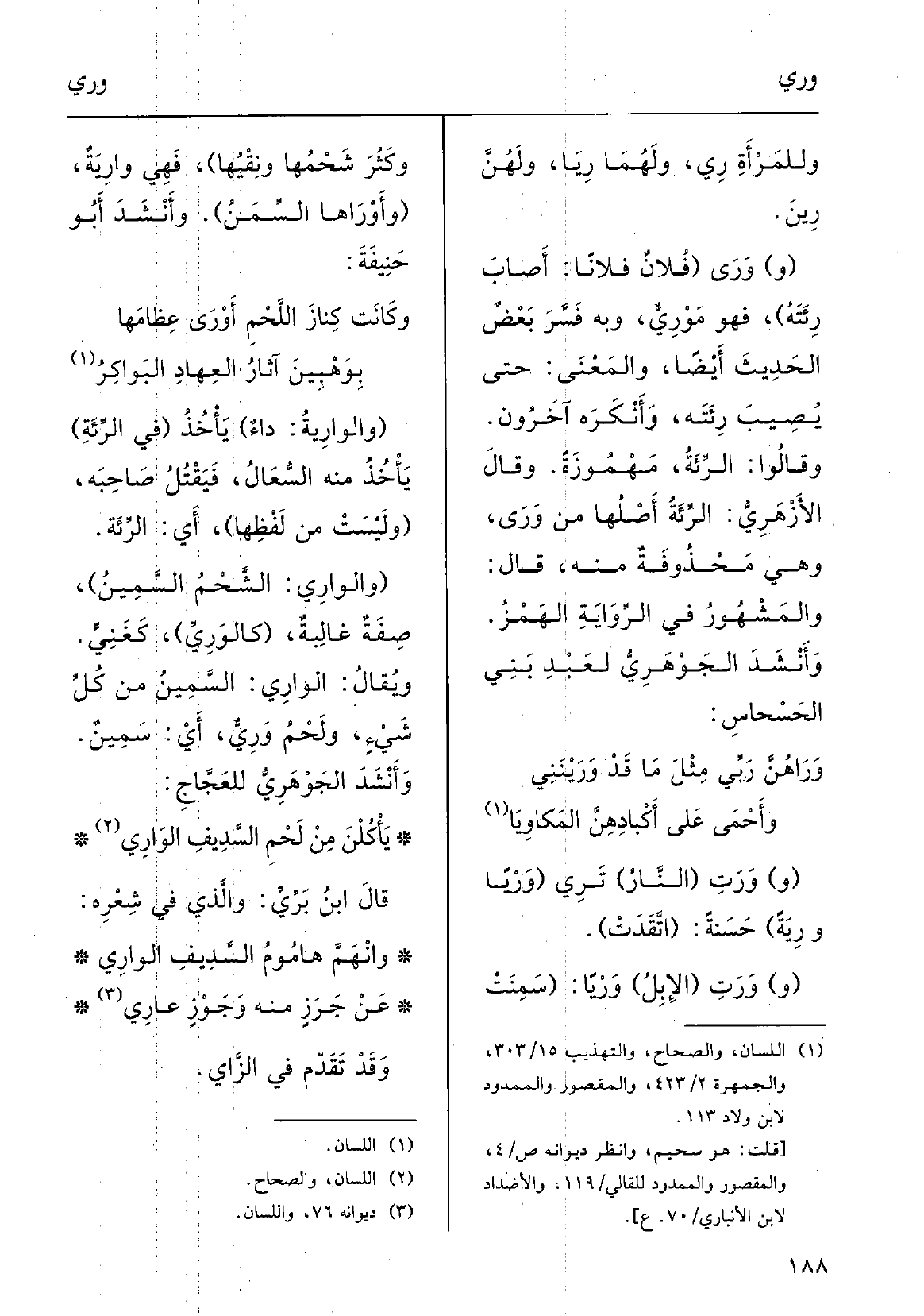 ولَحْمُ! وَرِيٌّ: أَي سَمِينٌ، وأنْشَدَ الجَوْهرِي للعجَّاج: