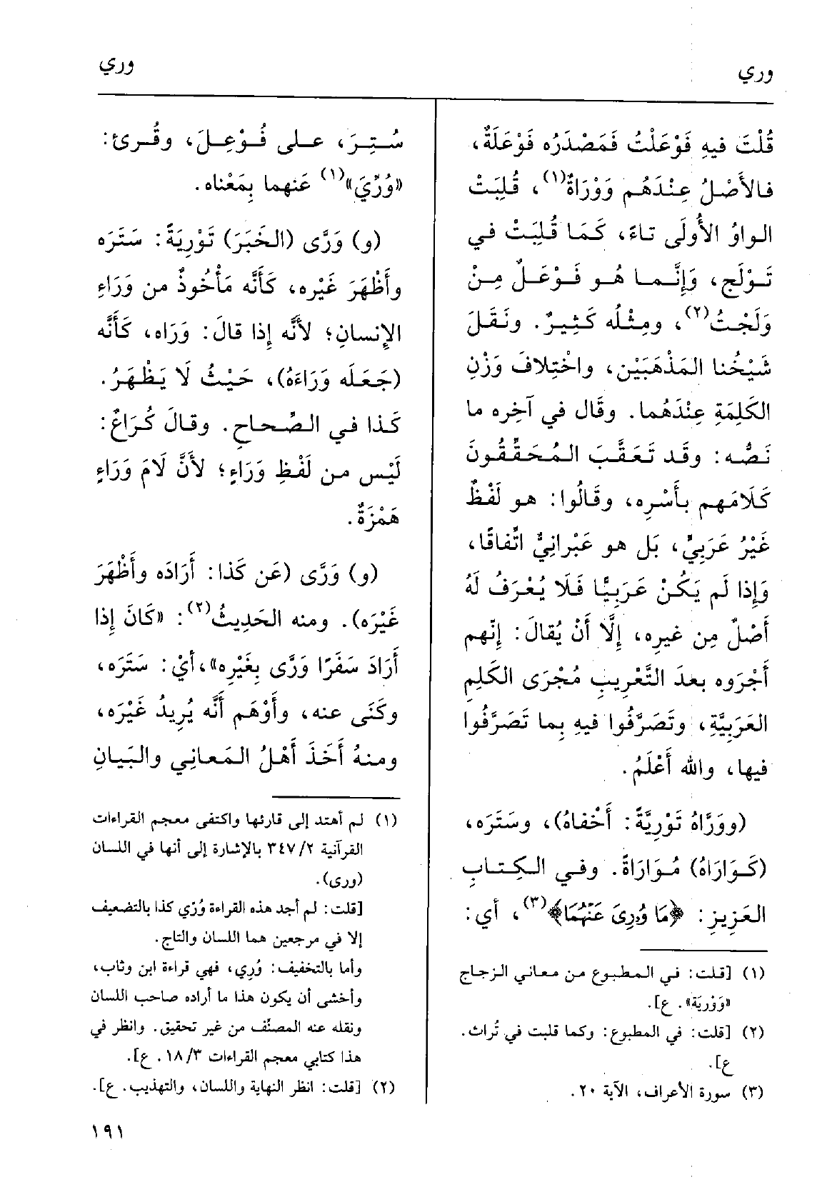 وَقَالَ كُراعٌ: ليسَ مِن لَفْظِ وَراء لأنَّ لامَ وَرَاء هَمْزةٌ.