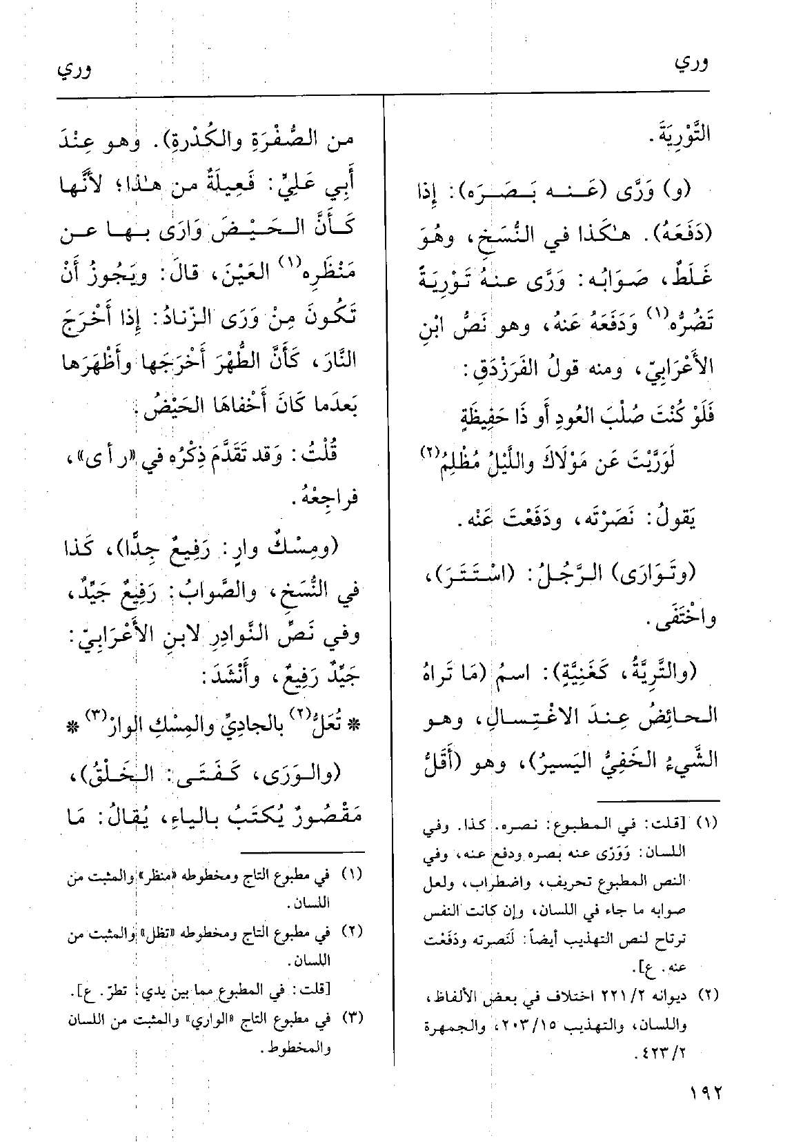 (و) } وَرَّى (عَنهُ بَصَرَه) ؛ إِذا (دَفَعَه) ؛ هَكَذَا فِي النسخِ وَهُوَ غَلَطٌ، صَوابُه: وَرَّى عَنهُ {تَوْرِيَةً نَصَرَه ودَفَعَه عَنهُ؛ وَهُوَ نَصُّ ابنِ الأعْرابي؛ وَمِنْه قولُ الفَرَزْدق: