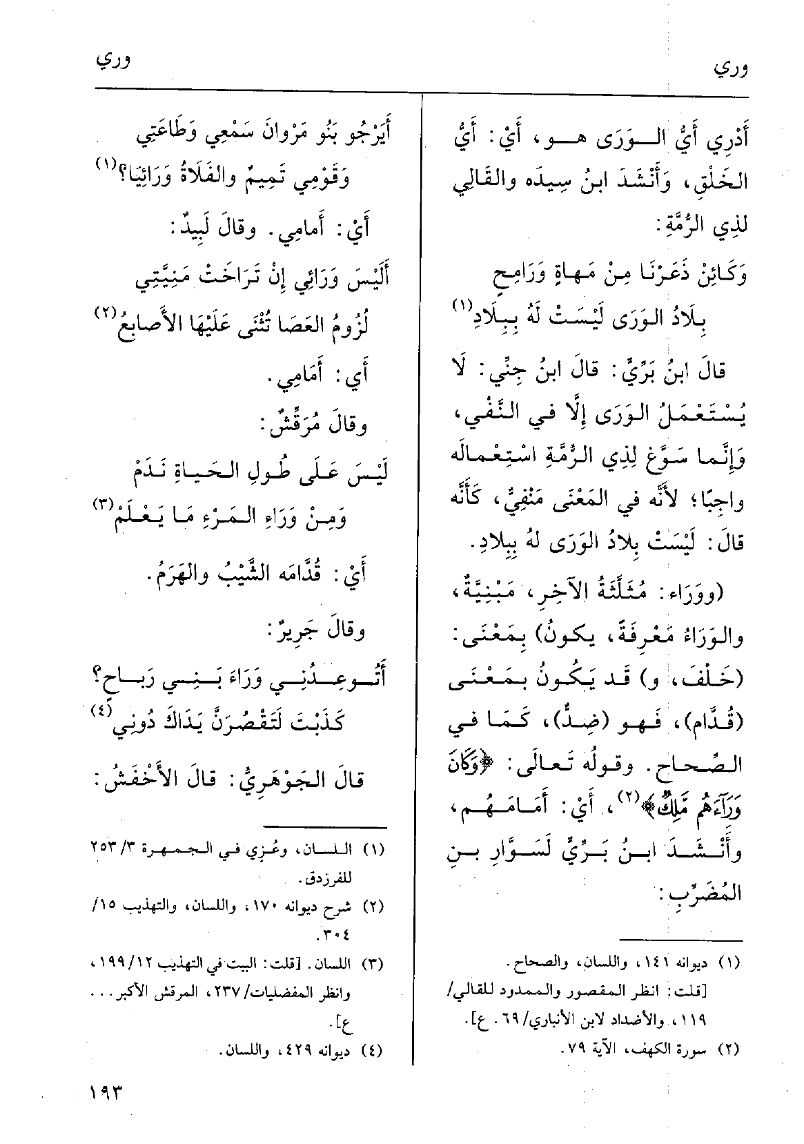 وقولهُ تَعَالَى: {كانَ} وَرآءهُم مَلِكٌ} ، أَي أَمامَهم، وأنْشَدَ ابنُ برِّي لسَوَّارِ بنِ المُضَرِّب: