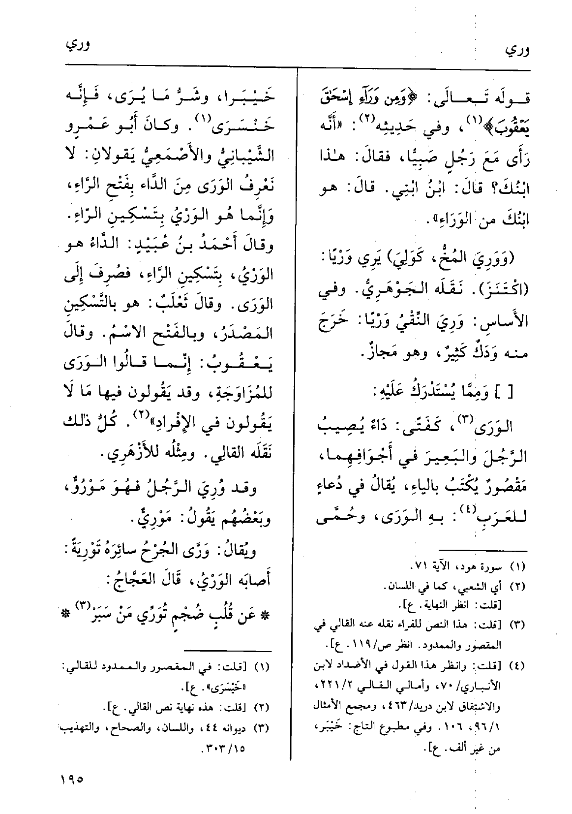 يقالُ فِي دُعاءٍ للعَرَبِ بِهِ الوَرَى وحُمَّى خَيْبَر وشَرُّ مَا يُرَى فإنَّه خَنْسَرَى؛ وكانَ أبَو عَمرو الشَّيْباني والأصْمعي يَقُولَانِ: لَا نَعْرِفُ الوَرَى من الدَّاءِ، بفَتْح الرَّاء، وإنَّما هُوَ} الوَرْيُ، بِتَسْكين الرَّاء.