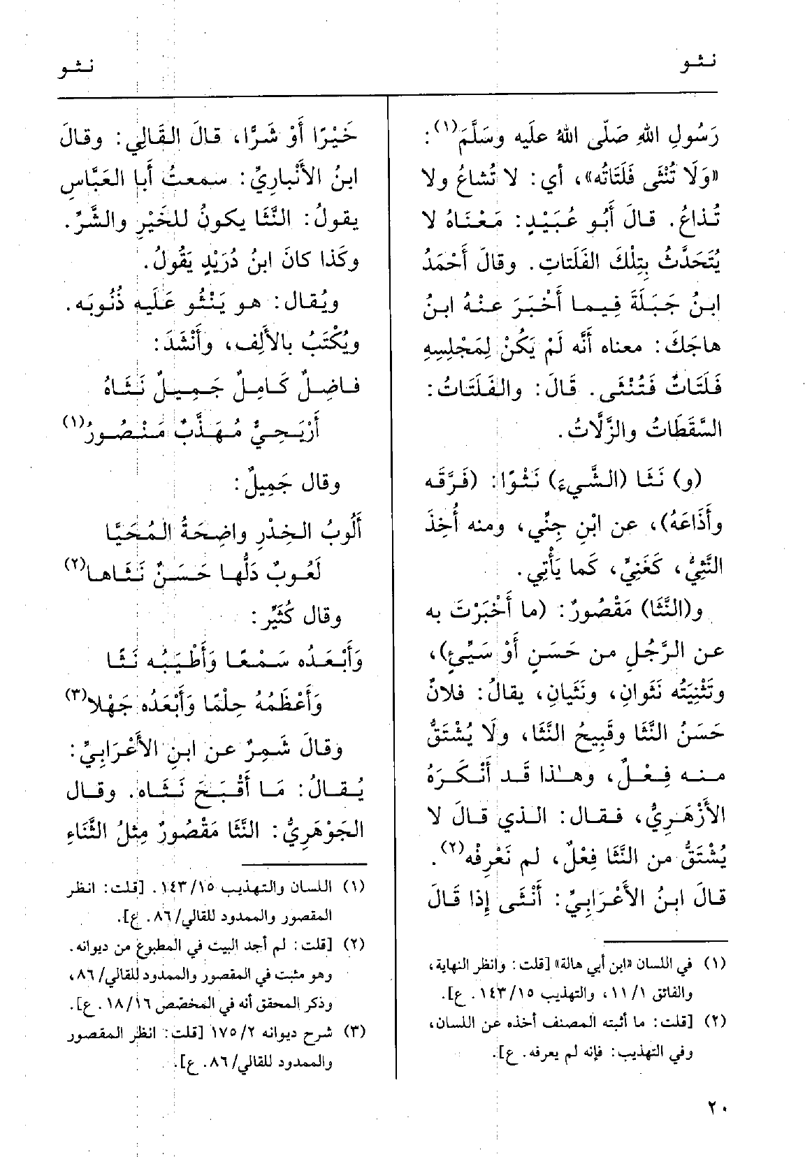قالَ القالِي: وَقَالَ، ابنُ الأنْبارِي: سَمِعْتُ أَبا العبَّاس يقولُ: النَّثا يكونُ للخَيْرِ والشرِّ؛ وَكَذَا كانَ ابنُ دُرَيْدٍ يقولُ. ويقالُ: هُوَ يَنْثُو عَلَيْهِ ذُنُوبَه؛ ويُكْتَبُ بالألفِ؛ وأنْشَدَ: