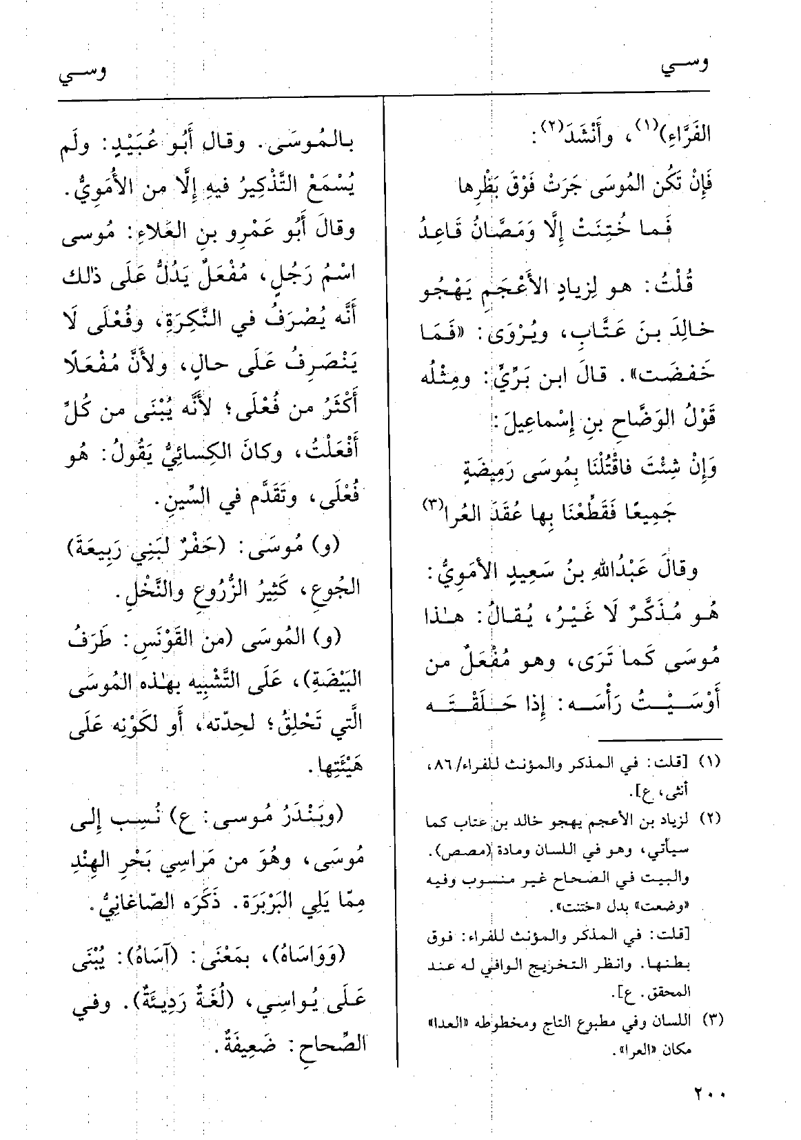 جمِيعاً فَقَطِّعنا بهَا عُقَدَ العُداوقال عبدُ اللهاِ بنُ سعيدٍ الأُمَويُّ: هُوَ مُذَكَّر لَا غَيْر، يقالُ: هَذَا {مُوسَى كَمَا ترَى، وَهُوَ مُفْعَلٌ مِن} أَوْسَيْت رأْسَه إِذا حَلَقْتَه {بالمُوسَى.