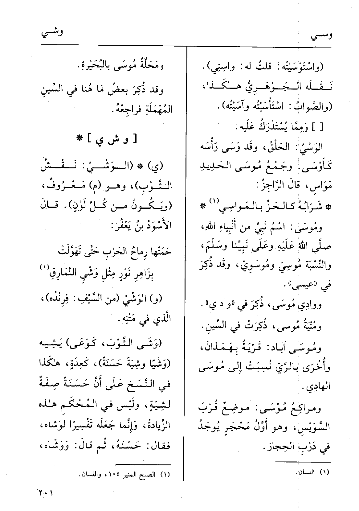 شَرابُه كالحَزِّ {بالمَواسِي} ومُوسَى: اسْمُ نَبِيَ مِن أَنْبياءِ اللهاِ، صلى الله عَلَيْهِ وعَلى نبيِّنا وَسلم؛ والنِّسْبَةُ {مُوسِيُّ} ومُوسَوِيُّ. وَقد ذُكِرَ فِي عِيسَى.