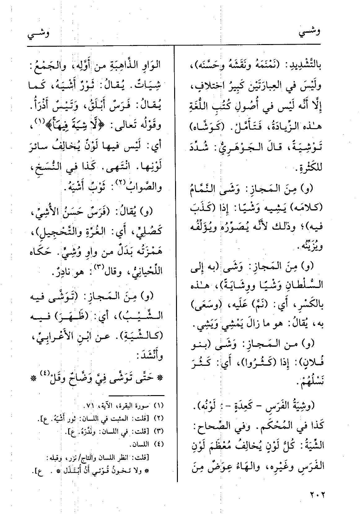 وَفِي الصِّحاح: {الشِّيَةُ كُلُّ لوْنٍ يُخالِفُ مُعْظَم لَوْنِ الفَرَسِ وغيرِهِ، والهاءُ عِوَضٌ مِن الواوِ الذاهِبَةِ مِن أَوَّلهِ، والجَمْعُ} شِياتٌ. يقالُ: ثَوْرٌ {أَشْيَهُ كَمَا يُقَال فَرَسٌ أَبْلَقُ وتَيْسٌ أَذْرَأُ؛ وقولهُ تَعَالَى: {لَا} شِيَةَ فِيهَا} ، أَي ليسَ فِيهَا لَوْن يُخالِفُ سائِرَ لَوْنِها، انتَهَى؛ كَذَا فِي النّسخ والصَّوابُ ثَوْبٌ {أَشْيَهُ.
