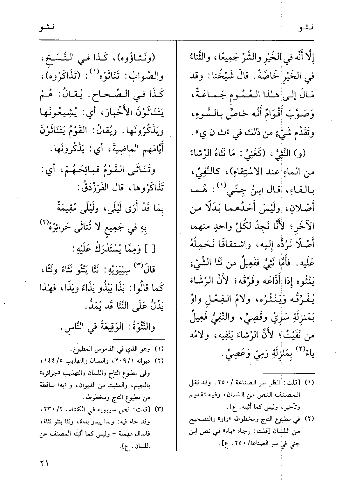 قَالَ ابنُ جنِّي: هُما أَصْلانِ وليسَ أَحَدُهما بَدَلاً مِن الآخرِ لأنَّا نَجِدُ لكلِّ واحِدٍ مِنْهُمَا أَصْلاً نَردّه إِلَيْهِ، واشْتِقاقاً نَحْمِلُه عَلَيْهِ، فأمَّا {نَثِيُّ فَفَعِيلٌ مِن} نَثا الشيءَ {يَنْثُوه إِذا أَذاعَهُ وفَرَّقَه لأنَّ الرِّشاءَ يُفَرِّقه ويَنْثُرُه، ولامُ الفِعْل واوٌ بمنْزِلَةِ سَرِيَ وقَصِيَ، والنَّفِيُّ فَعِيلٌ مِن نَفَيْتُ لأنَّ الرِّشاءَ يَنْفِيه، ولامُه واوٌ بمنْزلَةِ رَمِيَ وعَصِيَ.