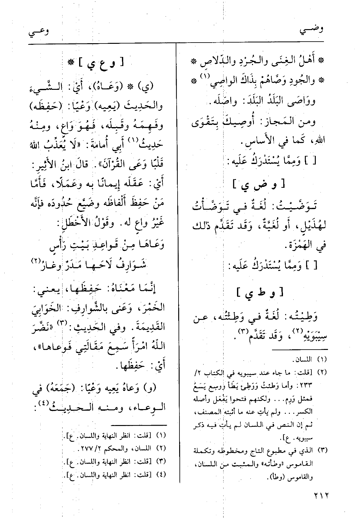 : ي (} وَعاهُ) ، أَي الشَّيءَ والحديثَ، ( {يَعِيهِ) } وَعْياً: (حَفِظَهُ) وفَهِمَهُ وقَبِلَهُ فَهُوَ {وَاعٍ؛ وَمِنْه حديثُ أَبي أَمامَةَ: (لَا يُعَذِّبُ اللهاُ قَلْباً} وَعَى القُرْآنَ) ؛ قَالَ ابنُ الْأَثِير: أَي عقلَه إِيمَانًا بِهِ وعَمَلاً، فأَمَّا مَنْ حَفِظَ أَلْفاظَه وضَيَّع حُدُودَه فإنَّه غيرُ واعٍ لَهُ؛ وقولُ الأخْطل: