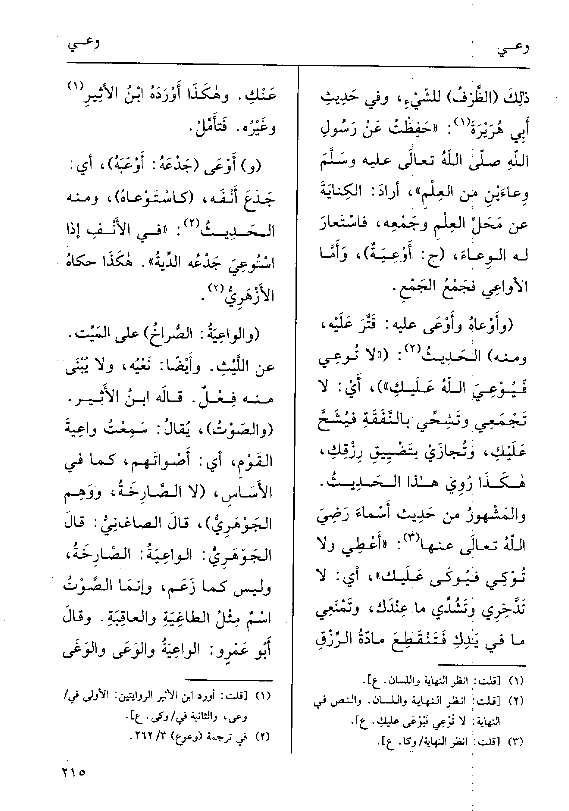 ذلكَ (الظَّرْفُ) للشيءِ. وَفِي حديثِ أبي هُرَيْرَة: (حَفِظْتُ عَن رَسُولِ اللهاِ صلى الله عَلَيْهِ وَسلم {وِعاءَيْنِ مِنَ العِلْم) ، أَرادَ الكِنايَةَ عَن مَحَلِّ العِلْم وجَمْعِه فاسْتَعارَ لَهُ} الوِعاءَ؛ (ج {أَوْعِيةٌ) ، وأَمَّا} الأَواعِي فجمْعُ الجَمْع.