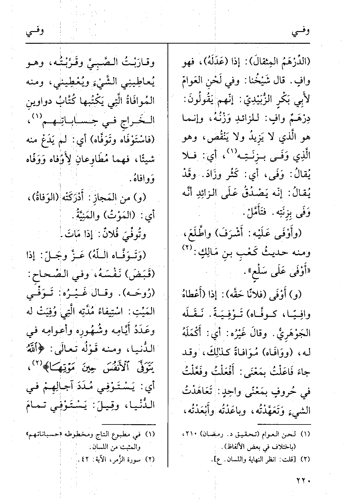 قَالَ شيْخُنا: وَفِي لَحْنِ العَوام لأبي بكْرٍ الزَّبيدِي أنَّهم يقولونَ دِرْهَمٌ وافٍ للزَّائِدِ وَزْنه، وإنَّما هُوَ الَّذِي لَا يزيدُ وَلَا يَنْقُصُ، وَهُوَ الَّذِي وَفَى بزِنَتِه، أَي فَلَا يقالُ: وَفَى أَي كَثُرَ وزادَ؛ وَقد يقالُ إنَّه يَصْدقُ على الزائِدِ أنَّه} وَفَى بزِنَتِهِ؛ فتأَمَّل.