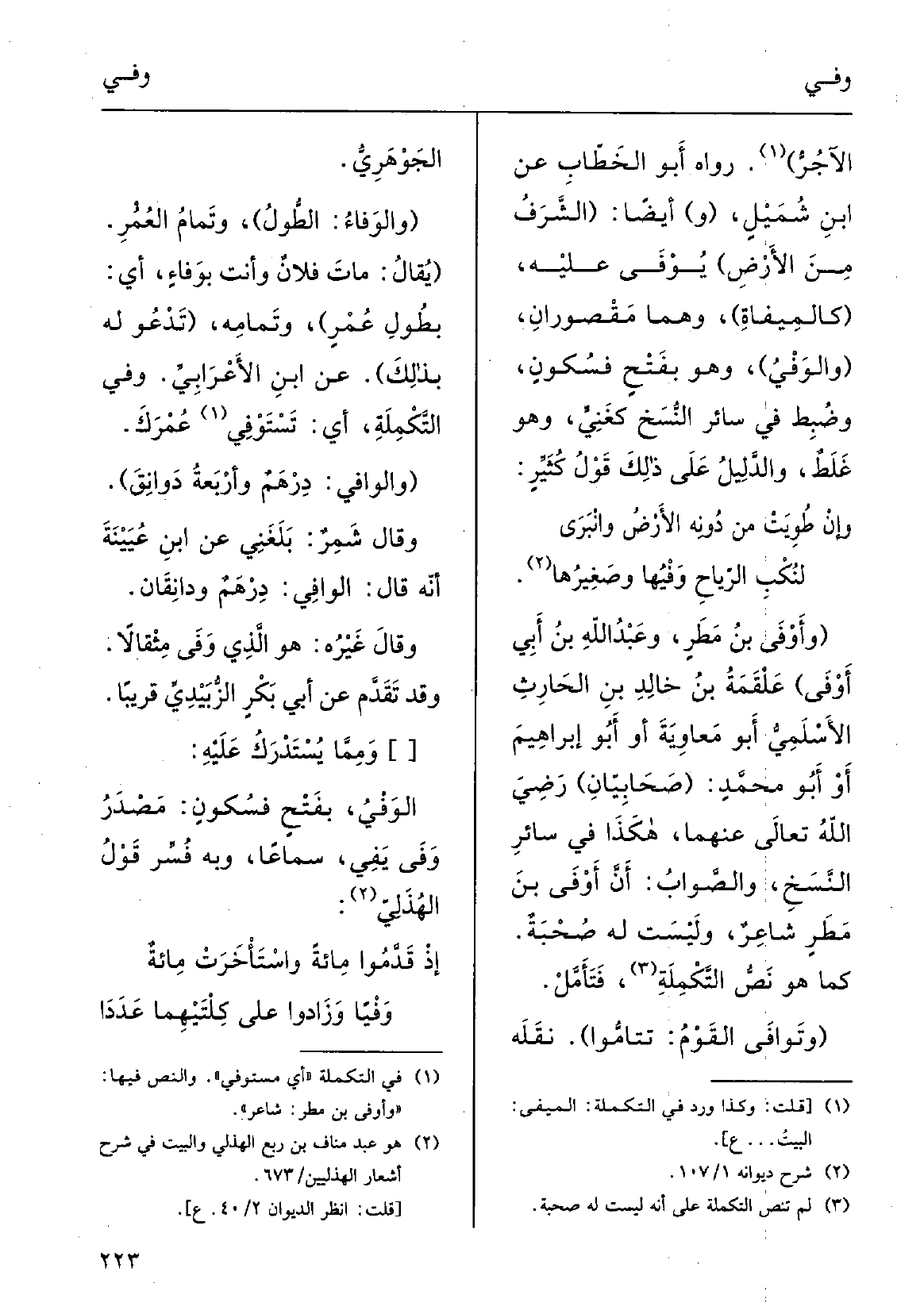 {الوَفْيُ بِفَتْح فسكونٍ: مَصْدَرُ وَفَى يَفِي، سَمَاعا، وَبِه فُسِّر قولُ الهُذَلي:
