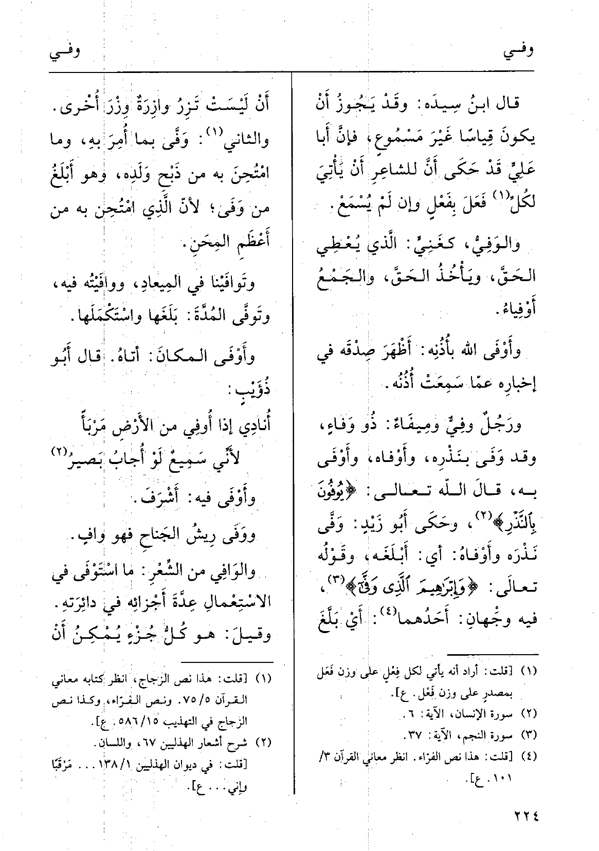 ورجُلٌ} وَفِيٌّ {ومِيفاءٌ: ذُو} وَفاءٍ، وَقد {وَفَى بنَذْرِهِ،} وأَوْفاهُ {وأَوْفى بِهِ؛ قالَ اللهاُ تَعَالَى: {} يُوفُونَ بالنَّذْرِ} .