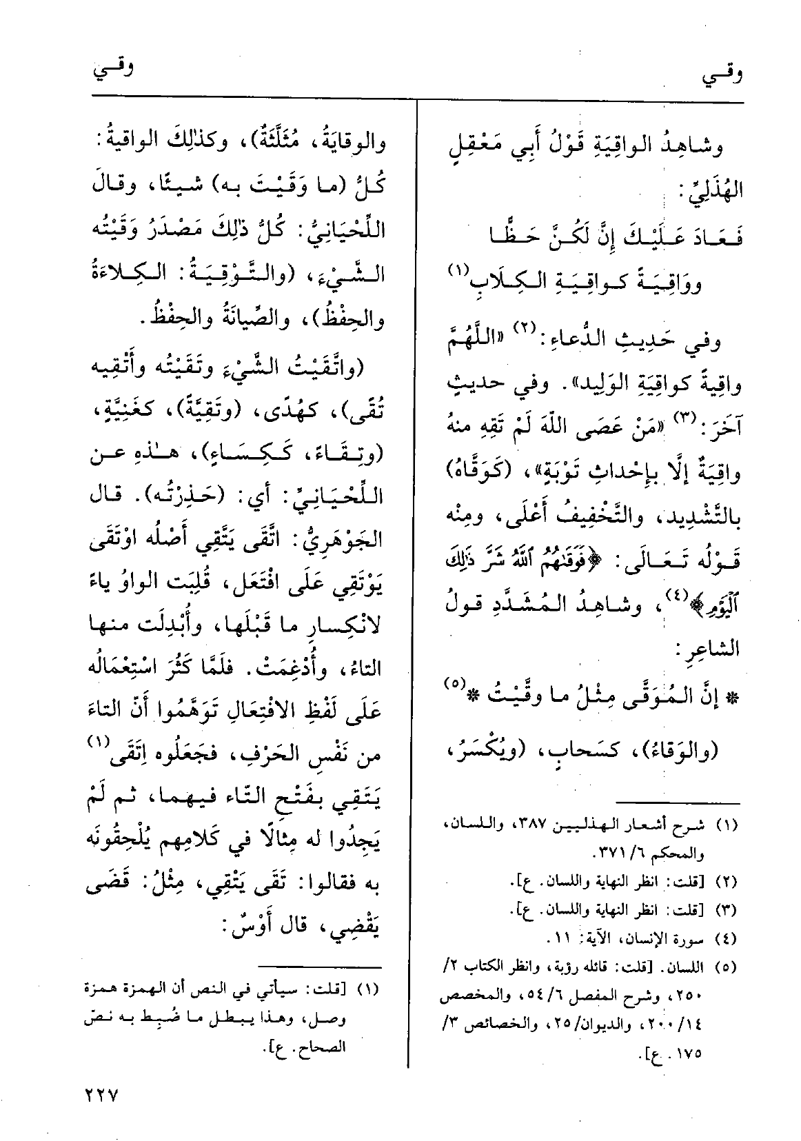 وشاهِدُ {الواقِيَةِ قولُ أَبي مَعْقِل الهُذَليّ:
