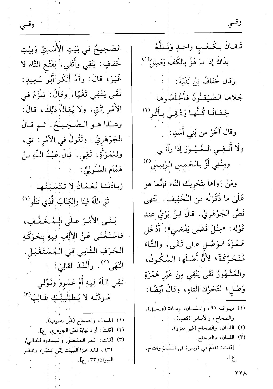 قَالَ ابنُ برِّي عنْدَ قَوْله مِثْل قَضَى يَقْضِي: أَدْخَل هَمْزَة الوَصْل على تَقى، وَالتَّاء مُتَحرَّكَة، لأنَّ أَصْلَها السّكونُ، والمَشْهورُ} تَقى {يَتْقِي مِن غَيْرِ هَمْزةِ وَصْل لتحرّكِ التاءِ، وَقَالَ أَيْضاً: الصَّحِيحُ فِي بيتِ الأَسَدِي وبيتِ خُفاف} يَتَقي {وأَتَقي، بفَتْح التاءِ لَا غَيْر، قالَ: وَقد أَنْكَر أَبو سعيدٍ} تَقَى {يَتْقي} تَقْياً، وَقَالَ: يلزمُ فِي الأمْرِ {اتْقِ، وَلَا يقالُ ذَلِك، قالَ: وَهَذَا هُوَ الصَّحيحُ.