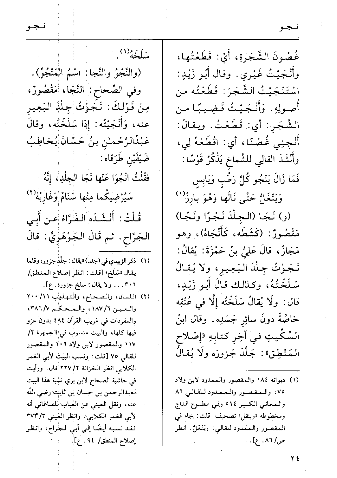 قالَ عليُّ بنُ حَمْزة: يقالُ {نَجَوْتُ جِلْدَ البَعيرِ، وَلَا يقالُ سَلَخْته؛ وكَذلكَ قالَ أَبو زيْدٍ، قالَ: وَلَا يقالُ سَلَخْته إلاَّ فِي عُنُقهِ خاصَّةً دونَ سائِر جَسَدِه.
