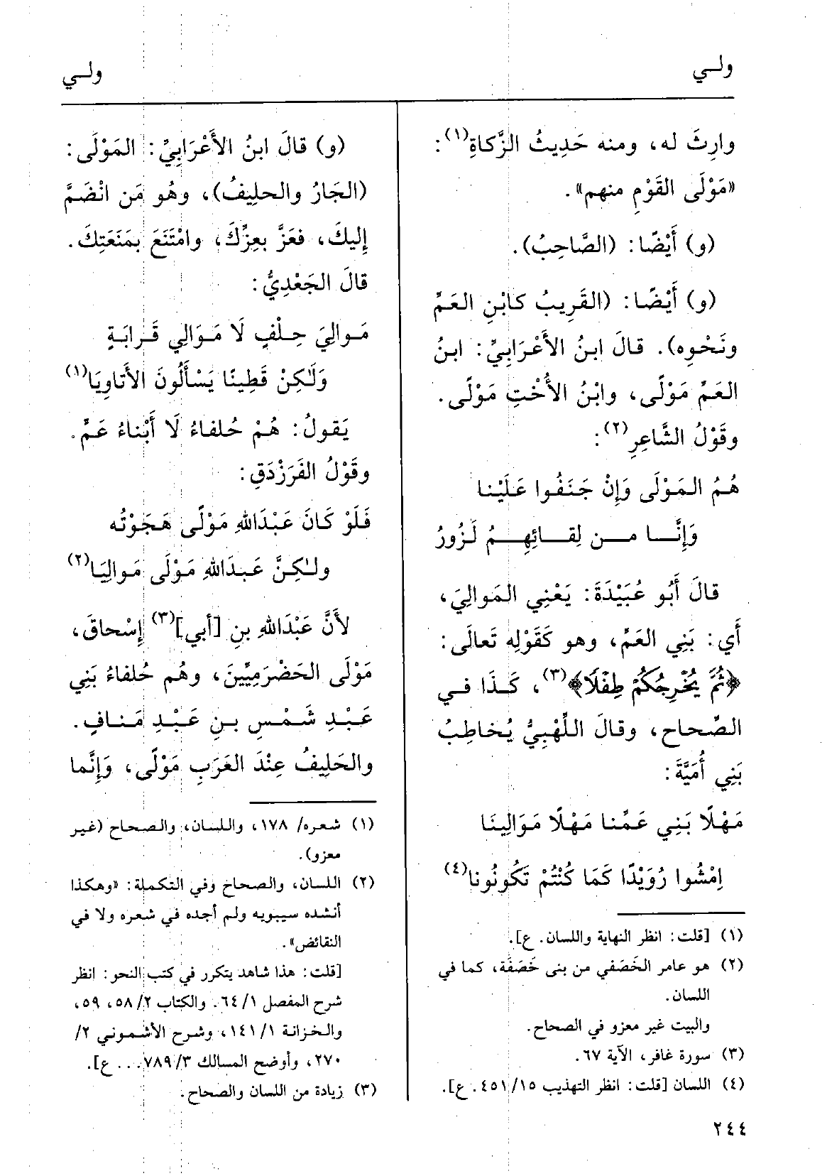 امْشُوا رُوَيْداً كَمَا كنْتُمْ تَكُونُونا (و) قالَ ابنُ الأعْرابي: المَوْلَى (الجارُ والحَليفُ) ، وَهُوَ مَنِ انْضَمَّ إليكَ فعَزَّ بعِزِّك وامْتَنَعَ بمَنَعَتِك؛ قالَ الجَعْدي: