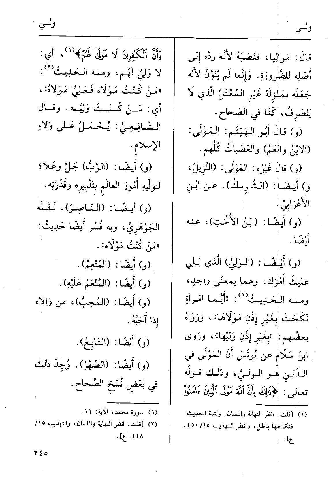 وَرَوى ابنُ سَلام عَن يُونُس: أنَّ المَوْلَى فِي الدِّيْن هُوَ} الوَلِيُّ، وذلكَ قولهُ تَعَالَى: {ذلكَ بأنَّ اللهَ مَوْلَى الذينَ آمَنُوا وأَنَّ الكافِرِينَ لَا {مَوْلَى لَهُم} ، أَي لَا وَلِيَّ لهُم، وَمِنْه الحديثُ: (مَنْ كُنْتُ} مَوْلاهُ فعليٌّ مَوْلاهُ) ، أَي مَنْ كنتُ {وَلِيَّه؛ وَقَالَ الشافِعِيُّ: يحملُ على} وَلاءِ الإسْلامِ.