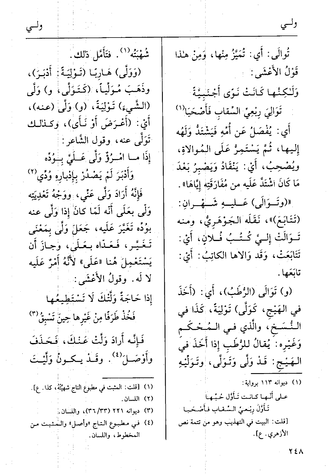 فَخُذْ طَرَفاً من غَيْرها حينَ تَسْبِقُفإنَّه أَرادَ: {وَلَّتْ عنْكَ، فحذفَ وأَوْصَل، وَقد يكونُ} وَلَّيْتُ