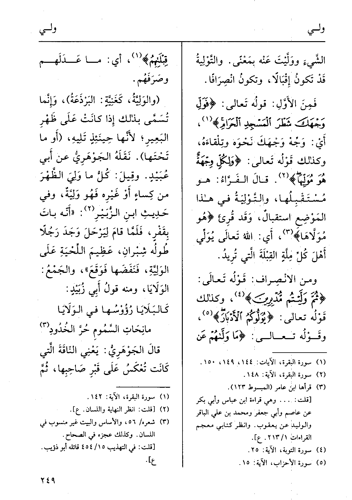 {فوَلِّ وَجْهَكَ شَطْرَ المَسْجِدِ الحَرَام، أَي وَجِّهْ وَجْهَكَ نَحْوَه وتِلْقاءَهُ؛ وكَذلكَ قولْهُ تَعَالَى: {ولكُلَ وِجْهةٌ هُوَ} مُوَلِّيها} ؛ قالَ الفرَّاء: هُوَ مُسْتَقْبِلُها، {والتَّوْلِيةُ فِي هَذَا المَوْضِع اسْتِقْبالٌ، وَقد قُرِىءَ: هُوَ} مُوّلاَّها، أَي اللهاُ تعالَى {يُوَلِّي أَهْلَ كلِّ مِلَّةٍ القِبْلَة الَّتِي تُريدُ. ومِن الانْصِرافِ: قولهُ تَعَالَى: {ثمَّ} وَلَّيْتُم مُدْبِرِينَ} ؛ وكذلكَ قوْلُه تعالَى: { {يُولُّوكُم الأَدْبَارَ} ؛ وقولُه تَعَالَى: {مَا} وَلاَّهُم عَن قِبْلَتِهم} ، أَي مَا عَدَلَهُم وصَرَفَهُم.