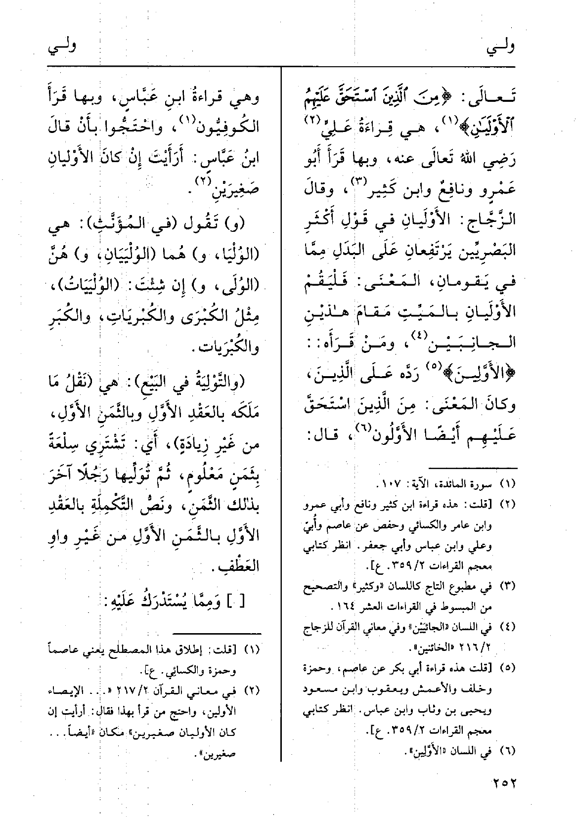 تَعَالَى: {من الَّذين اسْتَحَقَّ عَلَيْهِم {الأَوْلَيانِ} ، هِيَ قِراءَةُ عليَ، رضِيَ اللهاُ تَعَالَى عَنهُ، وَبهَا قَرَأَ أَبو عَمْرٍ وونافِع وَكثير؛ وَقَالَ الزجَّاجُ:} الأَوْلَيانِ فِي قوْلِ أَكْثَر البَصْرِيِّين، يرْتَفِعان على البَدَلِ ممَّا فِي يَقُومَان، المَعْنى: فليَقُم الأَوْلَيانِ بالميِّتِ مَقامَ هذَيْن الجانِبَيْن، ومَنْ قَرَأَ {الأَوَّلِين رَدَّه على الَّذين، وكأنَّ المَعْنى من الَّذين اسْتَحَقَّ عَلَيْهِم أَيْضاً} الأَوَّلُون؛ قالَ: وَهِي قِراءَةُ ابنِ عبَّاس، وَبهَا قَرَأَ الكُوفِيّون، واحْتَجوا بِأَن قالَ ابنُ عبَّاس: أَرَأَيْت إِن كانَ الأَوْلَيانِ صَغِيرينِ.