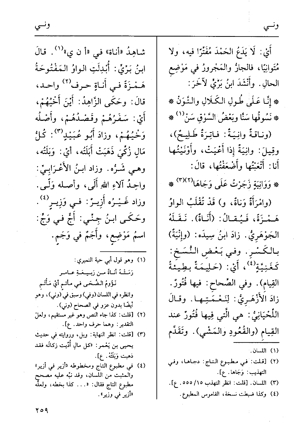 {ووانيةٍ زَجَرْتُ على دجاها (وامرأَةٌ} وَناةٌ، و) قد تُقْلب الواوُ هَمْزةً فيُقال ( {أَناةٌ) ، نقلَهُ الجَوْهرِي، زادَ ابنُ سِيدَه: (} وإِنِيَّةٌ) ، بِالْكَسْرِ وَفِي بعضِ النسخِ كغَنِيَّةٍ؛ أَي (حَليمةٌ بَطيئةُ القِيامِ) ؛ وَفِي الصِّحاح: فِيهَا فُتورٌ؛ زادَ الأزْهري لنَعْمَتِها.