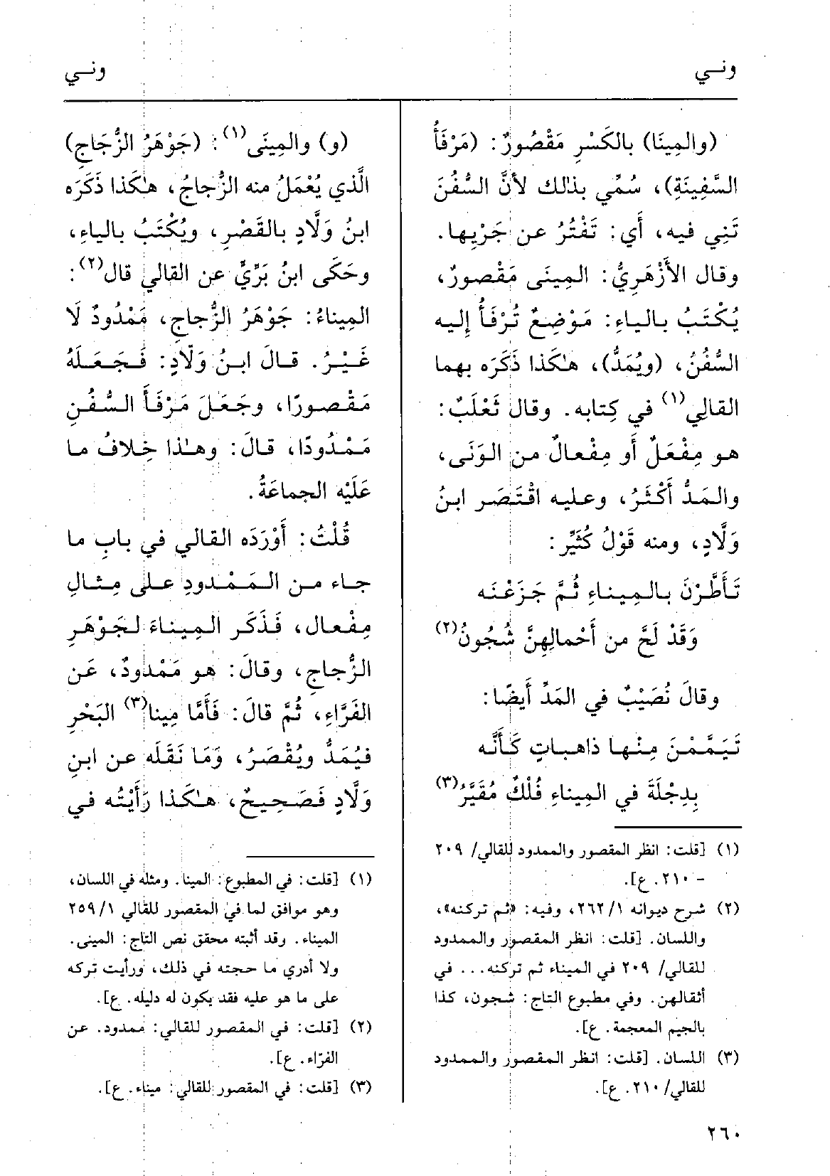 قُلْتُ: أوْرَدَه القالِي فِي بابِ مَا جاءَ مِن المَمْدودِ على مِثالِ مِفْعال فذَكَر المِيناءَ لجَوْهَر الزُّجاج، وقالَ: هُوَ مَمْدودٌ عَن الفرَّاء، ثمَّ قالَ. فأمَّا،} مِينا البَحْر فيُمَدُّ ويُقْصَر، وَمَا نقلَهُ عَن ابنِ وَلاَّد فصَحِيح، هَكَذَا رأَيْته فِي