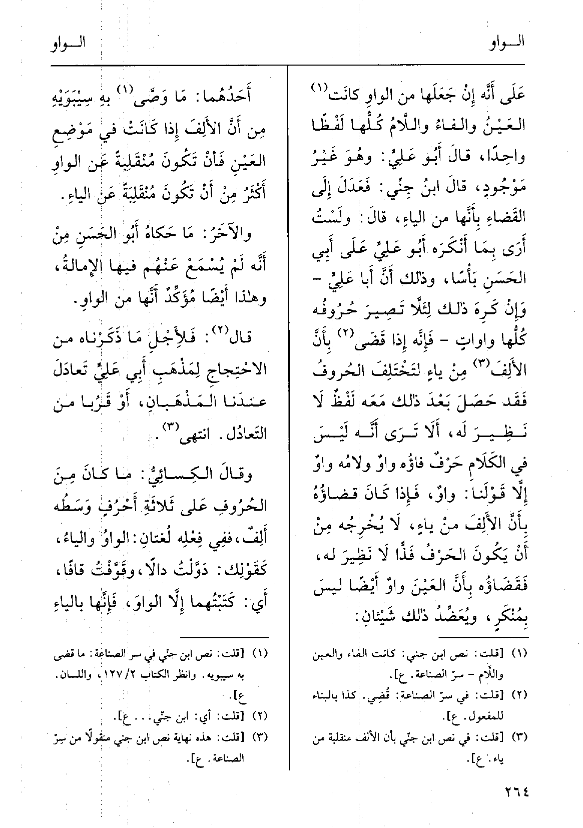 قَالَ ابنُ جنِّي: فعدلَ إِلَى القَضاءِ بأَنَّها من الياءِ، قالَ: ولستُ أَرَى بِمَا أَنْكَره أَبو عليَ على أَبي الحَسَن بأْساً، وذلكَ أنَّ أَبا عليَ وَإِن كَره ذلكَ لئَلاّ تَصِيرَ حُرُوفُه كُلُّها واواتٍ، فإنَّه إِذا قَضَى بأنَّ الأَلفَ من ياءٍ لتَخْتَلِف الحُرُوفُ فقد حَصَل بعدَ ذلكَ مَعَه لَفْظ لَا نَظِير لَهُ، أَلا تَرى أَنَّه ليسَ فِي الكلامِ حَرْف فاؤُه واوُ ولامُه واوُ إلاَّ قَوْلنا وَاو؟ فَإِذا كانَ قَضاؤُه بأنَّ الألفَ من ياءٍ لَا يُخْرِجُه مِن أَنْ يكونَ الحَرْف فَذًّا لَا نَظِيرَ لَهُ، فقَضاؤُه بأنَّ العينَ واوٌ أَيْضاً ليسَ بمُنْكَر، يُعَضِّدُ ذلكَ شَيئْان: أَحَدُهما: مَا وصَّى بِهِ سِيبَوَيْهٍ مِن أَنَّ الألفَ إِذا كانتْ فِي موضِعِ العَيْن فأَنْ تكونَ مُنْقلبةً عَن الواوِ أَكْثَرُ مِن أَنْ تكونَ مُنْقلبةً عَن الياءِ، والآخَرُ: مَا حكَاهُ أَبو الحَسَن مِن أَنَّه لم يُسْمَع عَنْهُم فِيهَا الإِمالَةُ، وَهَذَا أيْضاً يؤكِّدُ أنَّها من الواوِ؛ قالَ: فلأجْل مَا ذَكَرْناه مِن الاحْتِجاجِ لمذْهبِ أَبي عليَ تَعادَلَ عنْدَنا المَذْهبان أَو قَرُبا مِن التّعادل، انتَهَى.