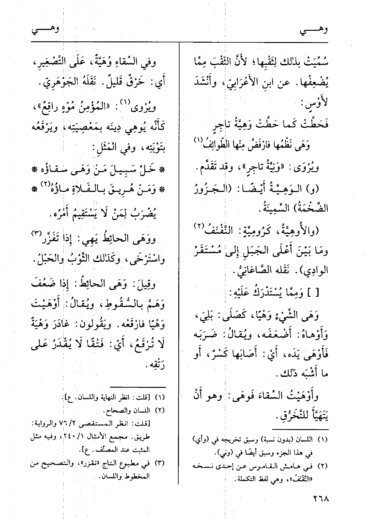 وقيلَ:} وَهَى الحائِطُ إِذا ضَعُفَ وَهَمَّ بالسُّقوطِ.