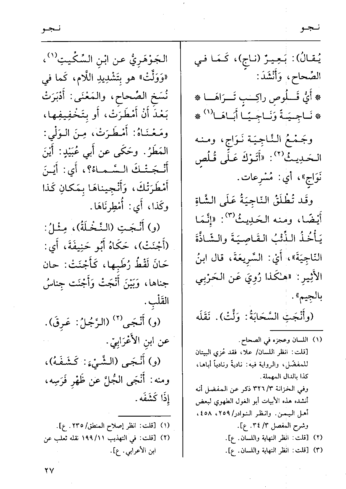 يقالُ) : بَعيرٌ ( {ناجٍ) ؛ كَمَا فِي الصِّحاحِ؛ وأَنْشَدَ: