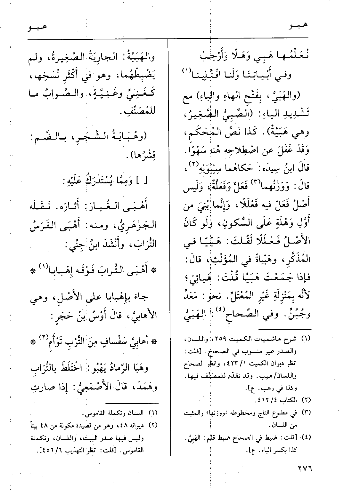 قالَ ابنُ سِيدَه: حكَاهُما سِيبَوَيْهٍ قالَ: ووَزْنها فَعَلٌّ وفَعَلَّةٌ، وليسَ أصْل فَعَلّ فِيهِ فَعْلَلاً وإنَّما بُني مِن أَوَّل وَهْلَةٍ على السّكونِ، وَلَو كانَ الأَصْل فَعْلَلاً لقلْت {هَبْياً فِي المُذكَّر} وهَبْياةً فِي المُؤنَّث، قالَ: فَإِذا جمعْتَ هَبَيًّا قلْت هَبائيٌّ لأنَّه بمنْزلَةِ غَيْر المُعْتل نَحْو مَعدّ وجُبُنّ.