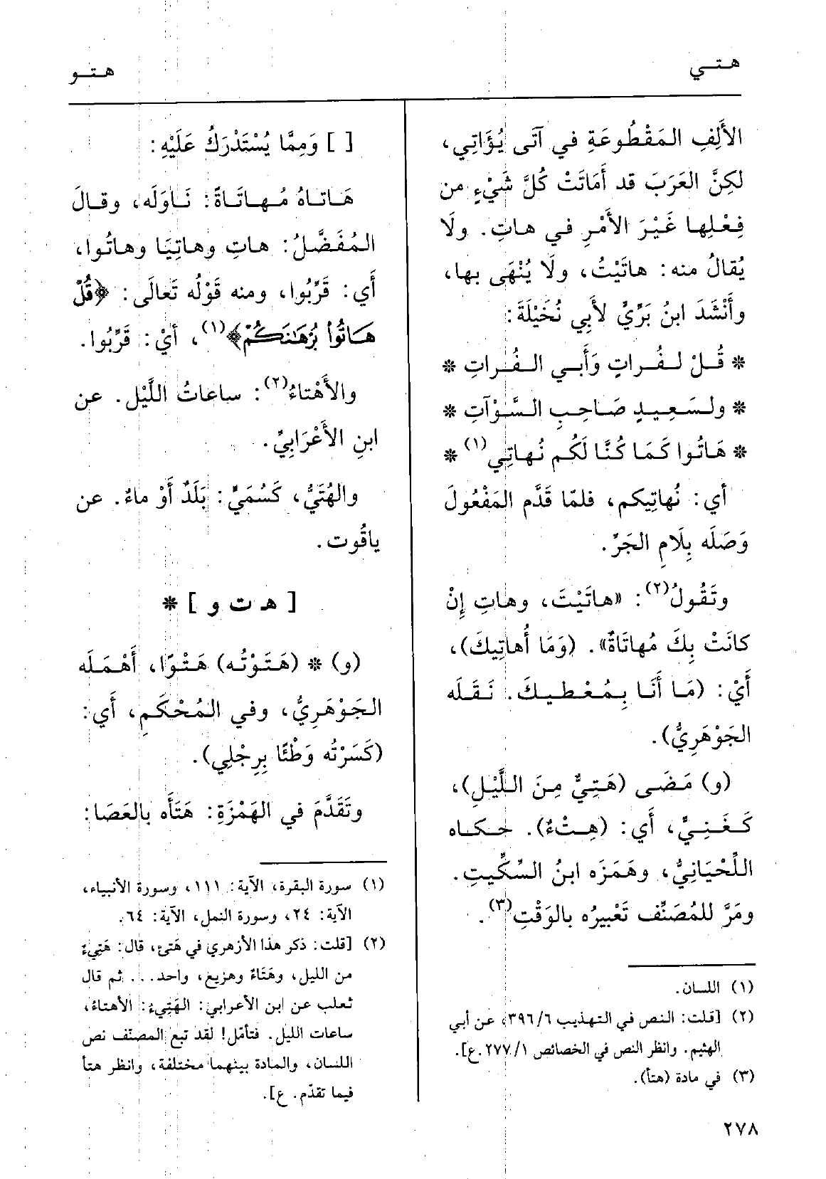 قل لفُراتٍ وأَبي الفُراتِولسَعِيدٍ صاحِبِ السَّوْآتِ {هاتُوا كَمَا كُنَّا لكُم} نُهاتِي أَي {نُهاتِيكُم، فلمَّا قدَّمَ المَفْعولَ وَصَلَه بلامِ الجَرِّ.