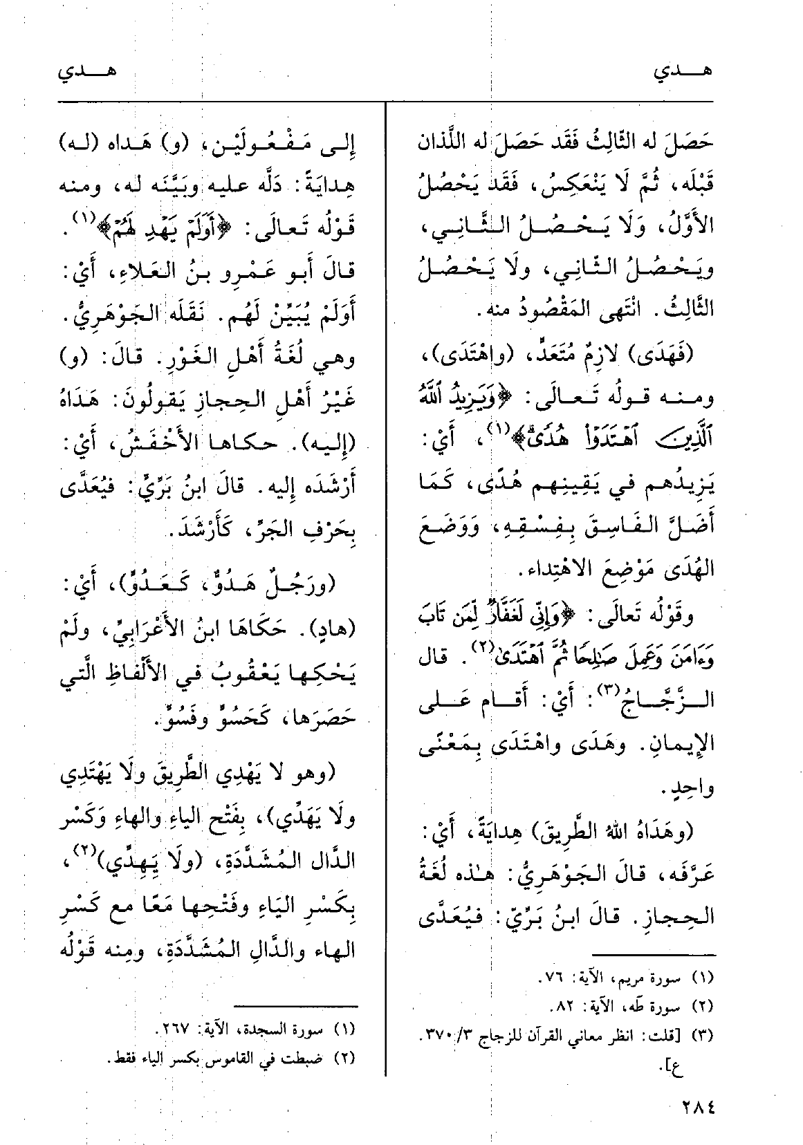 ( {فَهَدَى) لازِمٌ متعدَ، (} واهْتَدَى) ؛ وَمِنْه قولهُ تَعَالَى: {ويَزِيدُ ااُ الَّذين {اهْتَدَوْا هُدًى} ، أَي يَزِيدُهم فِي يَقِينِهم هُدًى كَمَا أَضَلَّ الفاسِقَ بفسْقِهووضَعَ الهُدَى مَوْضِعَ الاهْتِداءِ؛ وَقَوله تَعَالَى: {وإنِّي لَغَفّارٌ لمَنْ تابَ وآمَنَ وعَمِلِ صالِحاً ثمَّ} اهْتَدَى} ؛ قَالَ الزجَّاج: أَي أَقامَ على الإِيمانِ، {وهَدَى} واهْتَدَى بمعْنًى واحِدٍ.