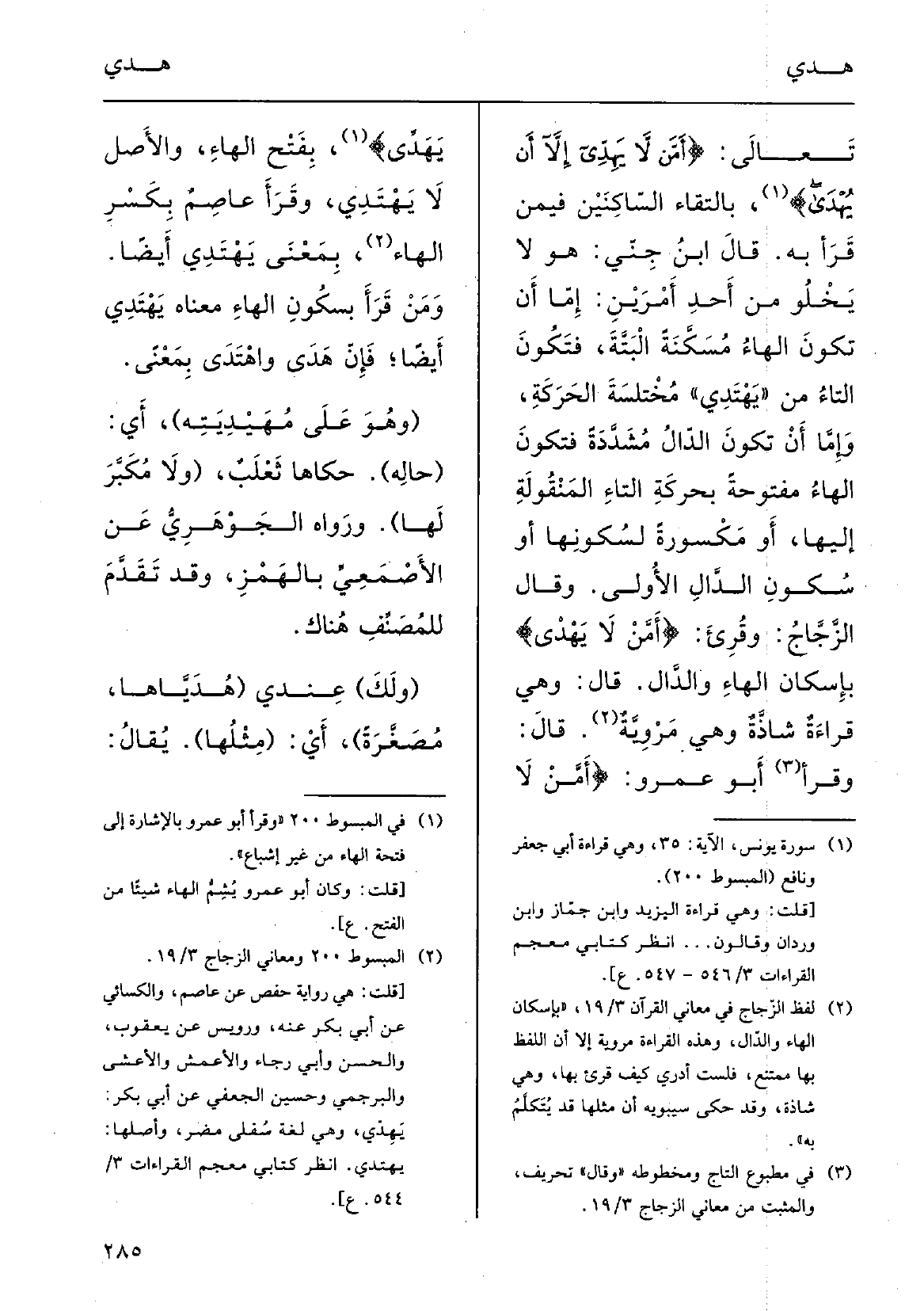 تَعَالَى: {أَمَّنْ لَا {يَهِدِّي إلاَّ أَنْ} يُهْدَى} ، بالْتِقاءِ السَّاكِنينِ فيمَنْ قَرَأ بِهِ؛ قالَ ابنُ جنِّي: هُوَ لَا يَخْلُو مِن أَحَدِ أَمْرَيْن: إمَّا أَنْ تكونَ الهاءُ مُسَكنةً البَتَّة فتكونَ التاءُ مِن {يَهْتَدِي مُخْتَلِسَة الحَرَكَة، وإمَّا أَنْ تكونَ الدالُ مَشدَّدَةً فتكونَ الهاءُ مَفْتوحةً بحرَكَةِ التاءِ المَنْقولَةِ إِلَيْهَا أَو مَكْسُورَةً لسُكونِها أَو سكونِ الدالِ الأُوْلى.