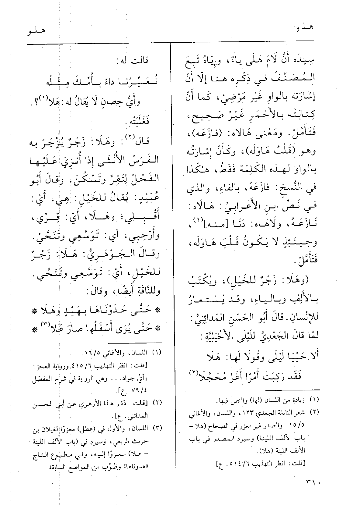 (} وهَلاَ: زَجْرٌ للخَيْلِ) ؛ ويُكْتَبُ بالألفِ وبالياءِ، وَقد يُسْتعارُ للإِنسانِ قالَ أَبو الحَسَنِ المَدايني لما قَالَ الْجَعْدِي لليلى الأخيلية: