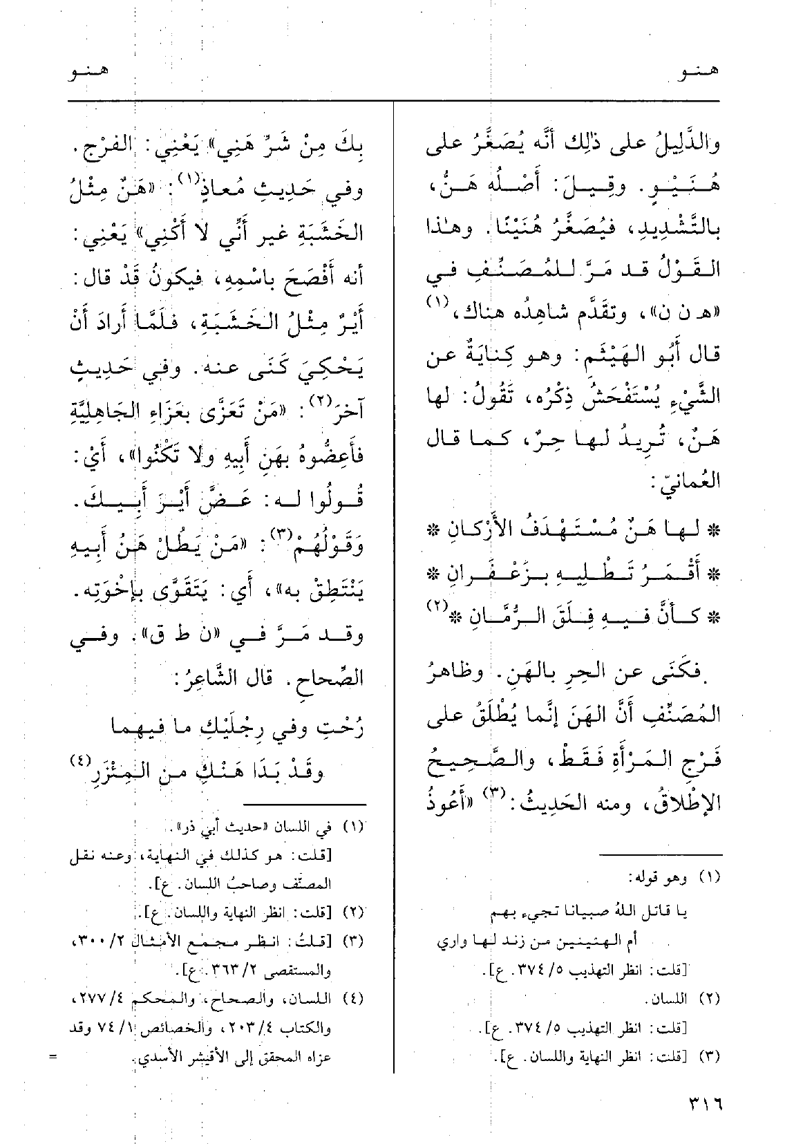 وَفِي حديثٍ آخر: (مَنْ تَعَزَّى بعَزاءِ الجاِهلِيَّةِ فأَعِضُّوه} بهَنِ أَبيهِ وَلَا تَكْنُو) ، أَي قُولُوا لَهُ عَضَّ أَيْرَ أَبِيكَ؛ وقَوْلُهم: مَنْ يَطُلْ {هَنُ أَبيهِ يَنْتَطِقْ بِهِ، أَي يَتَقَوَّى بإخْوتِه؛ وَقد مَرَّ فِي نطق؛ وَفِي الصِّحاح قالَ الشاعرُ: