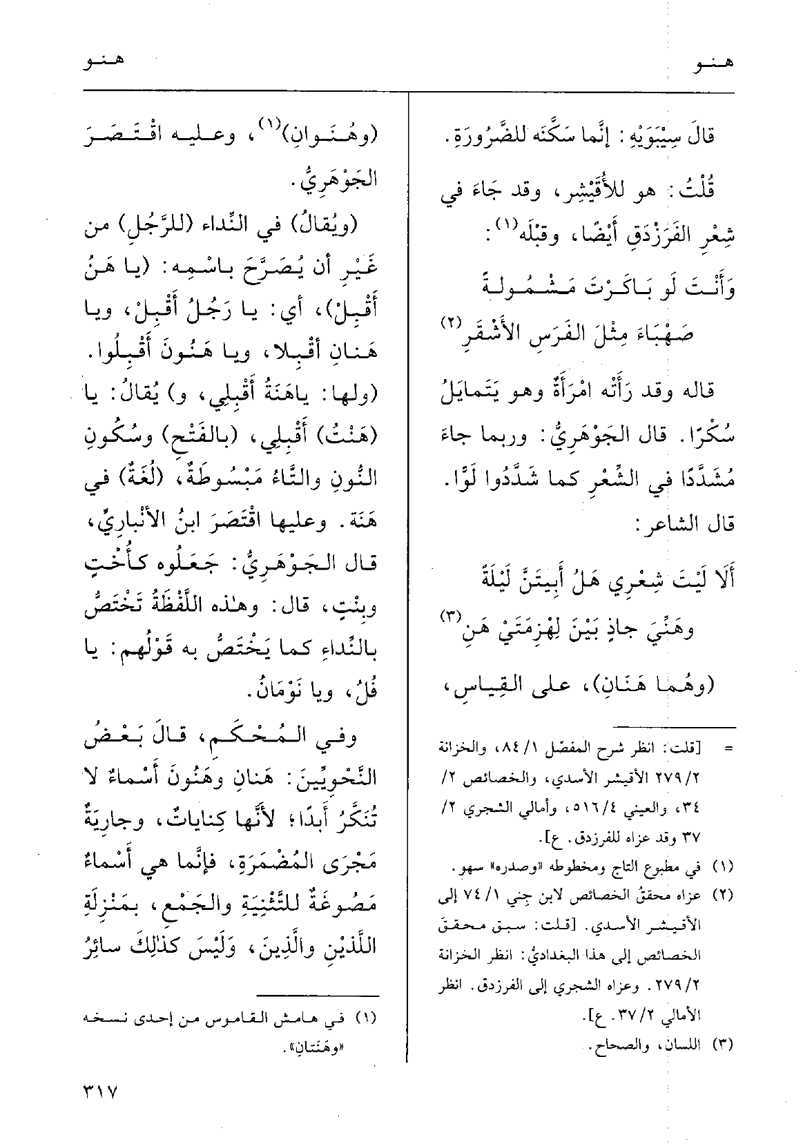 وَفِي المُحْكم: قالَ بعضُ النّحويِّين: {هَنانِ} وهَنُونَ أَسْماءَ لَا تُنَكَّرُ أَبَداً لأنَّها كِناياتٌ وجارِيَة مجْرَى المُضْمَرةِ، فإنّما هِيَ أَسْماءٌ مَصُوغَة للتّثْنيةِ والجَمْع بمنْزلَةِ اللَّذَيْنِ والذِين، وليسَ كَذلكَ سائِر