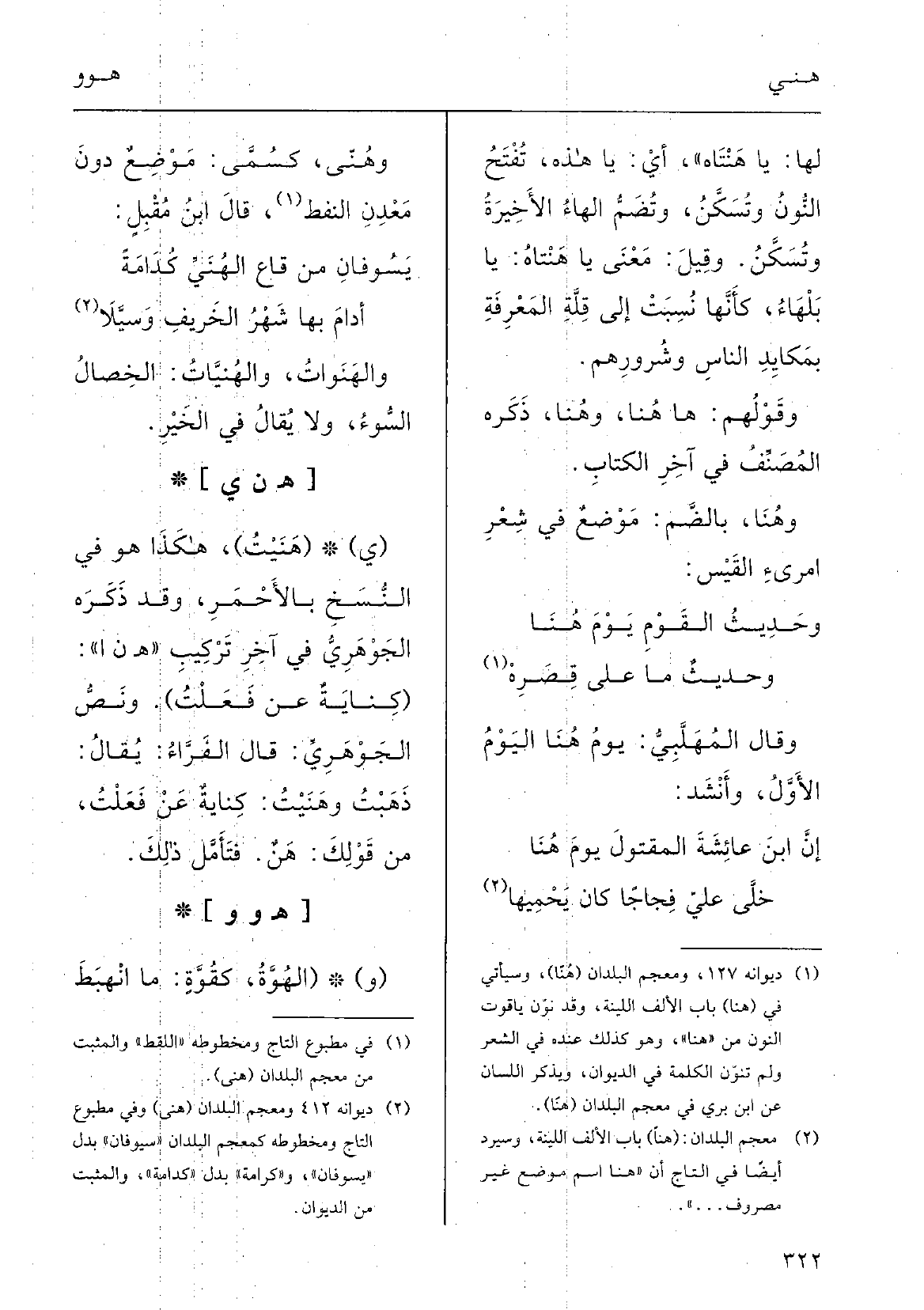 : (ي (} هَنَيْتُ) ؛ هَكَذَا هُوَ فِي النسخِ بالأحْمرِ وَقد ذَكَرَه الجَوْهرِي فِي آخرِ تَرْكيبِ هُنَا؛ (كِنايَةٌ عَن فَعَلْتُ) .
